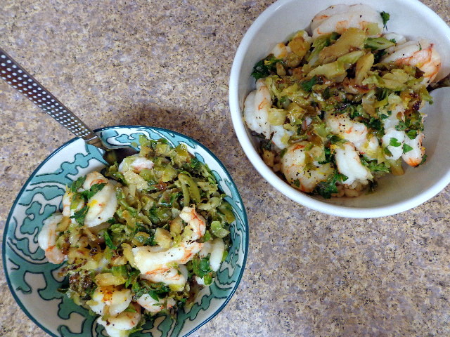 - Remove dish from oven. Top the sprouts evenly with shrimp, parsley, and lemon, and season with salt and pepper. Return to oven and bake, uncovered, for 12 additional minutes.