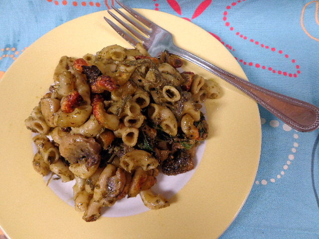 This dish is so simple that it is more an idea than a recipe. I considered taking away its page, but I like showcasing a meal that is super easy and filling but still healthy. If you decide to use leftover (cold) pasta it will be a little bit harder to stir everything together but the arugula will wilt just fine in the oven.