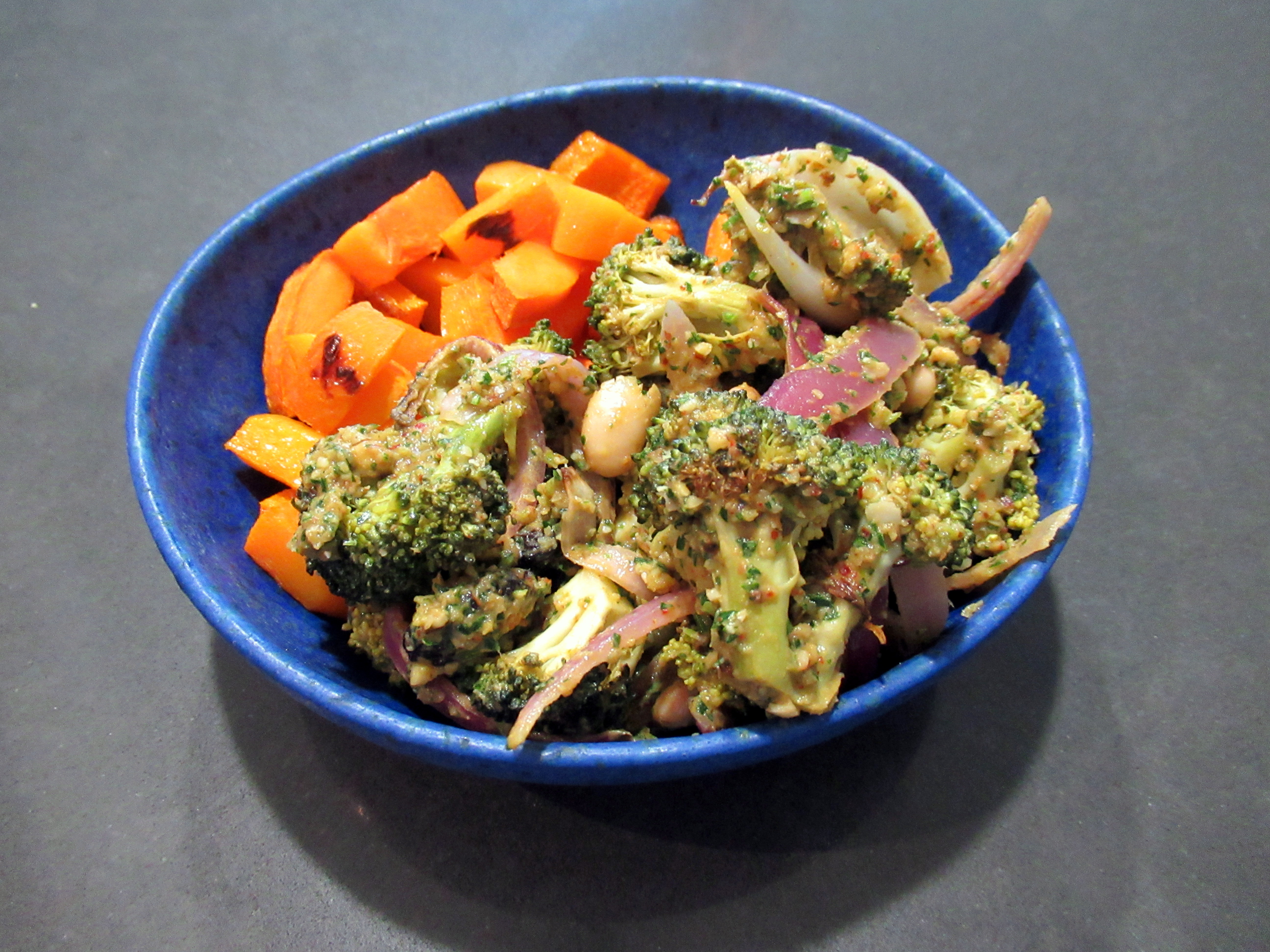 - Preheat your oven to 375 degrees Farenheit and prepare a baking sheet with cooking spray. Place broccoli on your prepared sheet and top evenly with red onion. Season with salt. Bake 35 minutes uncovered, then 15 minutes covered. Once finished roasting, place into a large bowl.