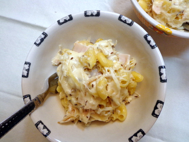 - Fold cooked macaroni, sauerkraut, toasted caraway seeds, and diced turkey into the cheese.