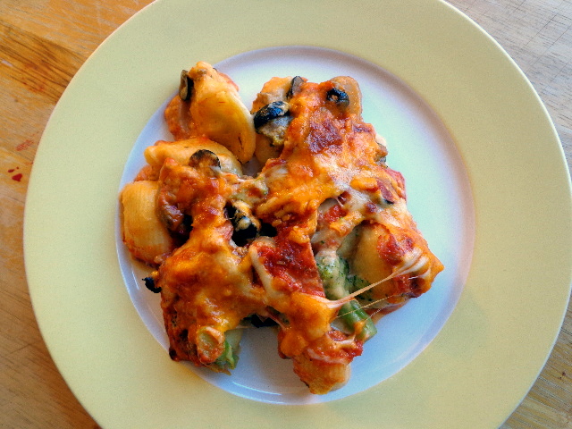 This recipe really does taste like a pizza, just with pasta instead of crust. What’s great about this dish is that you can customize it to your family’s taste / whatever ingredients you have available; the broccoli, mushrooms, and olives can be subbed out for spinach, bell peppers, onions, or whatever vegetables you prefer. If you skip the pepperoni to make this vegetarian, I recommend adding a Tbsp of dried oregano when you add your veggies. If you like things spicy, add a tsp of crushed red pepper.