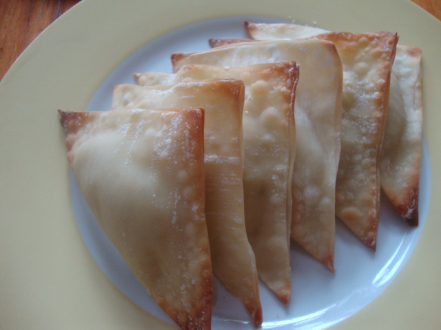 - Wet a finger and run it along the edges of a wrap. Fold the wrap over diagonally, forming a triangle with filling in the center. Firmly press around the edges to seal. Repeat with the remaining won tons.