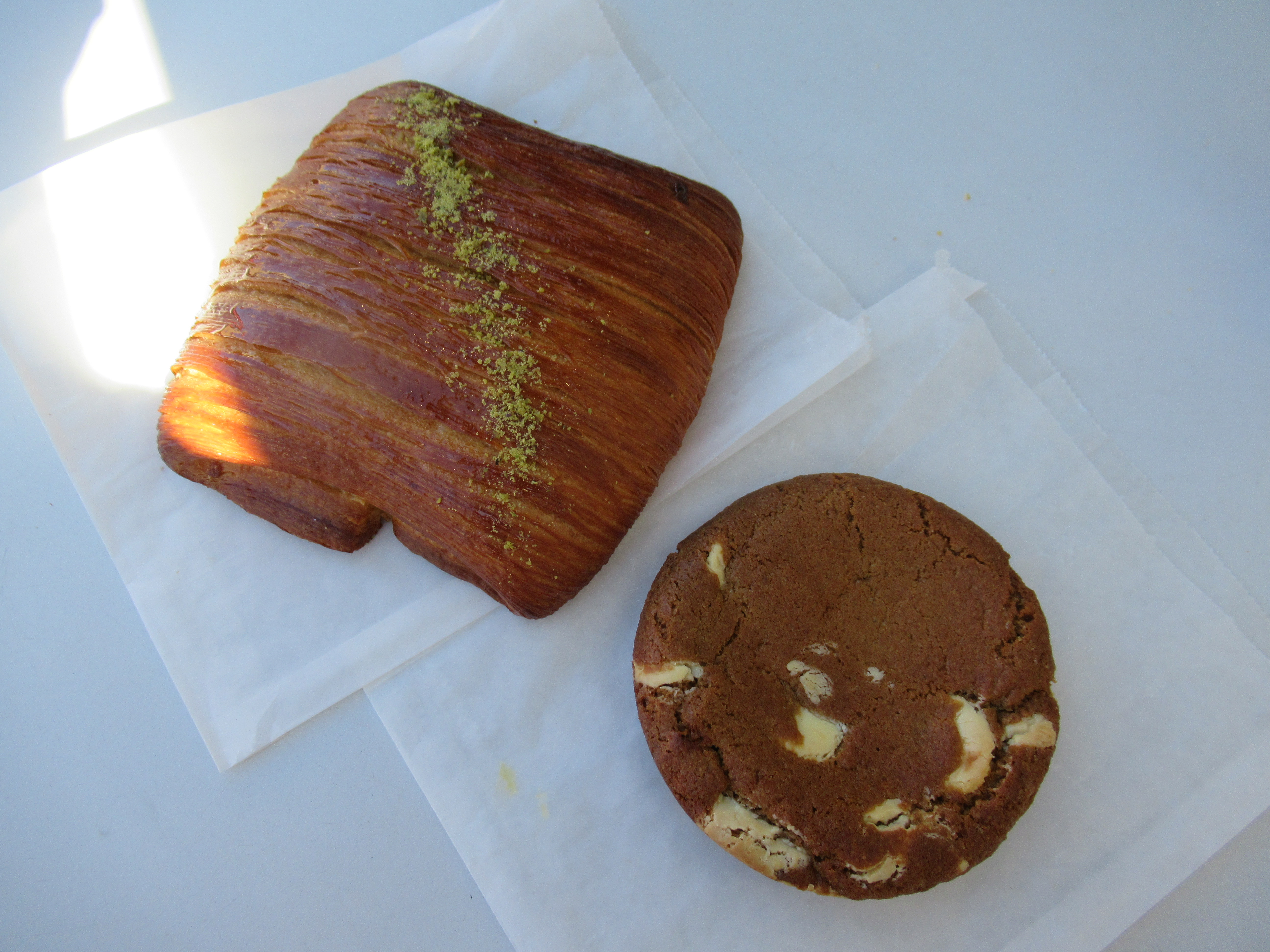 Pastries from Paloma Coffee and Bakery. Pistachio chocolate “something” plus a white chocolate butterscotch miso cookie.