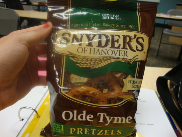 Yesterday morning (Thursday) I didn’t have time to pack food before school and my stomach was growling in our four-hour class. I ended up buying pretzels and diet pop from a vending machine at 9am.
