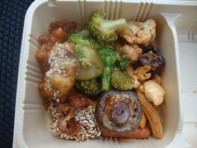 But then I turned to hot bar. Veggies from many different containers plus a few pieces of chicken.