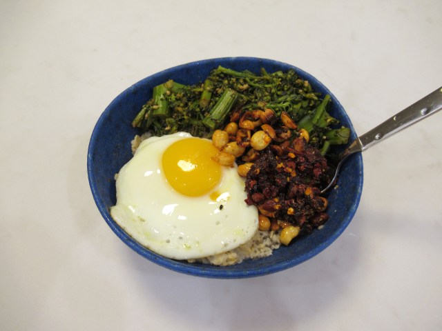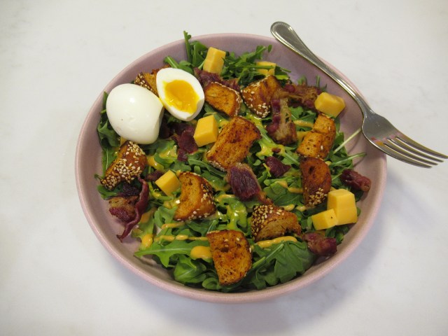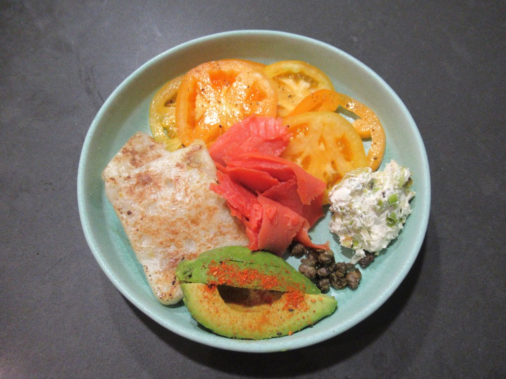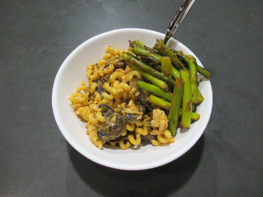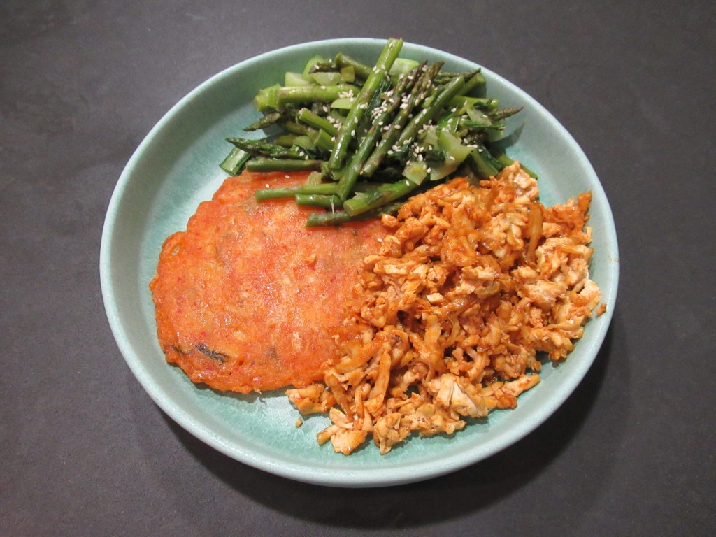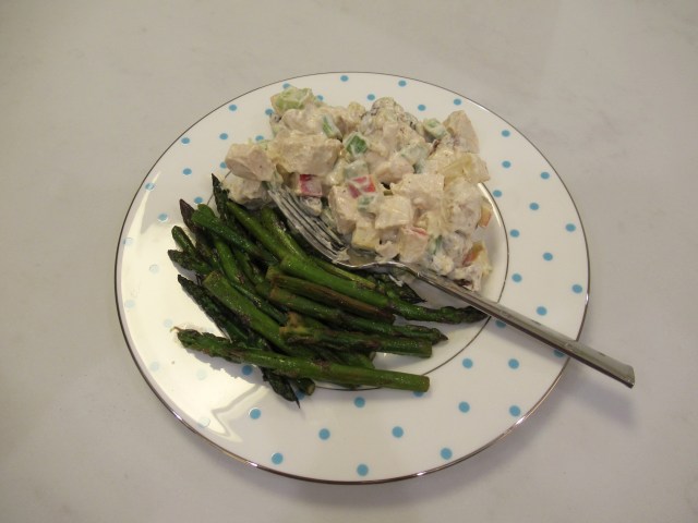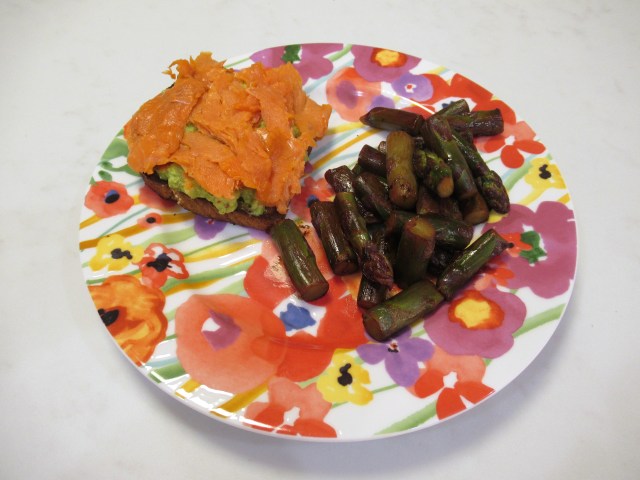 Tuna salad with an Eastern European vibe. Canned tuna and smoked trout / mayo, skyr, Dijon, and tons of horseradish / green onion / pickled beets / hard-boiled eggs. Plus sauteed asparagus and Trader Joe’s cornbread crackers.