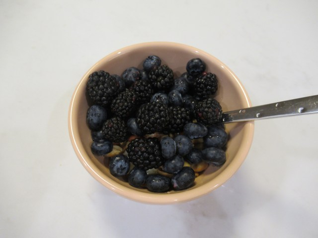 Berry smoothie. Frozen strawberries and blueberries, with chocolate protein powder, milk, and water. And a strawberry gummy.