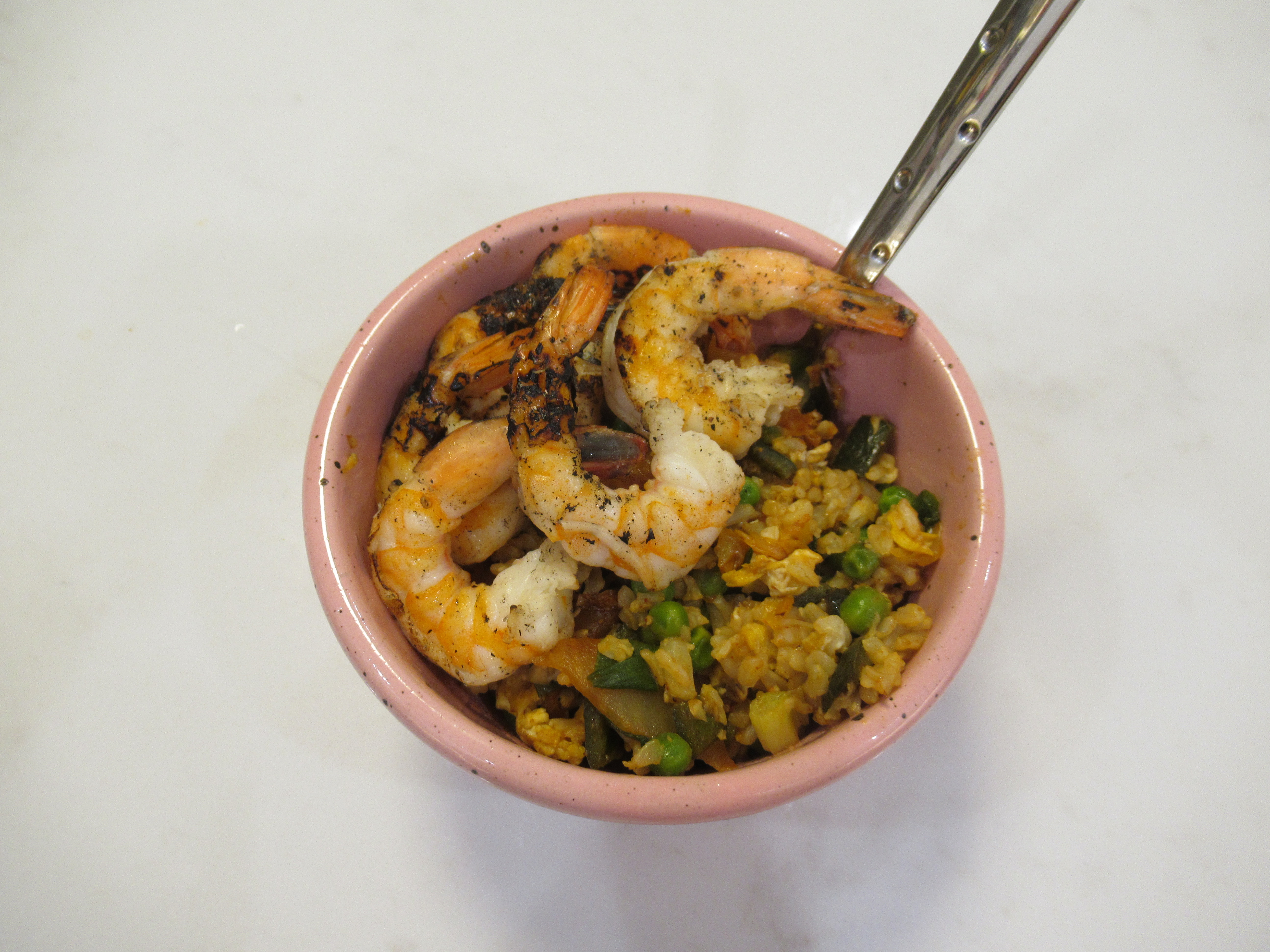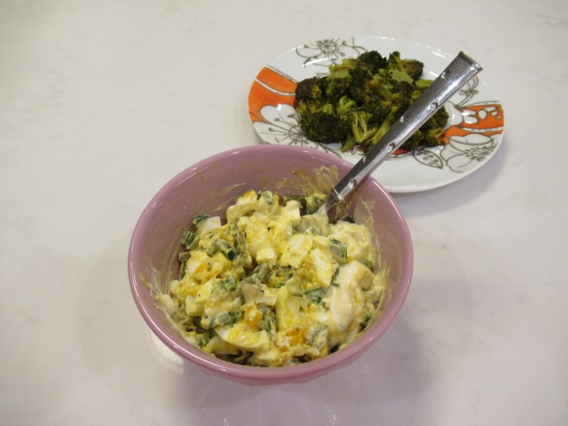 Crispy rice omelet. Eggs steamed on top of crisped-up leftover brown rice, kimchi, and extra-sharp cheddar. Plus roasted broccoli and baked chicken on the side.