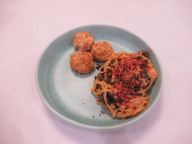 Greek-ish salad. Romaine, Trader Joe’s cilantro dressing, baby tomatoes, roasted zucchini, and roasted chickpeas (baked until crispy with evoo, salt, pepper, sumac, onion powder, and garlic powder). Plus Trader Joe’s dolmas.