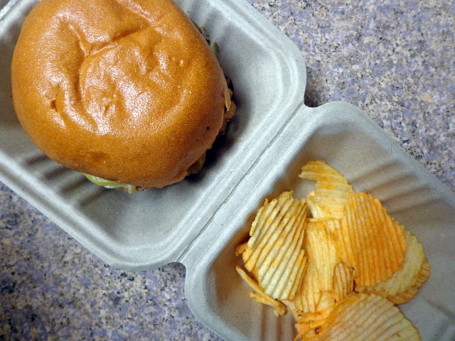 We tried the Sriracha Chicken Sandwich—all-natural chicken with Sriracha sauce, pickled banana peppers, arugula, tomatoes and lemon aioli on a baguette. Interesting, but not too spicy for the husband.