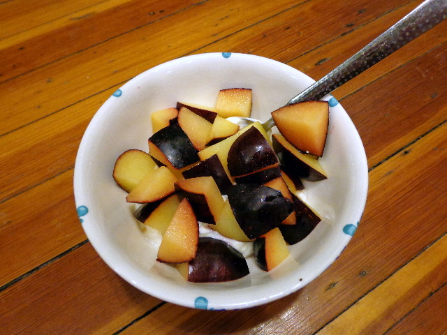 You have to do self-serve froyo when you’re at the mall. I did a small amount of plain tart and coconut yogurt, a medium amount of fresh fruit, and tons of popping boba.