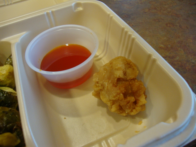 Eating materials, hot bar Asian style veggies, potatoes, and sweet and sour chicken.