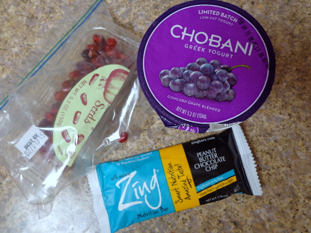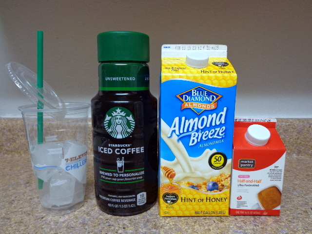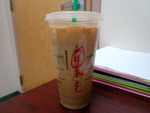 Iced coffee on the train and plain yogurt with peanut butter at my desk.