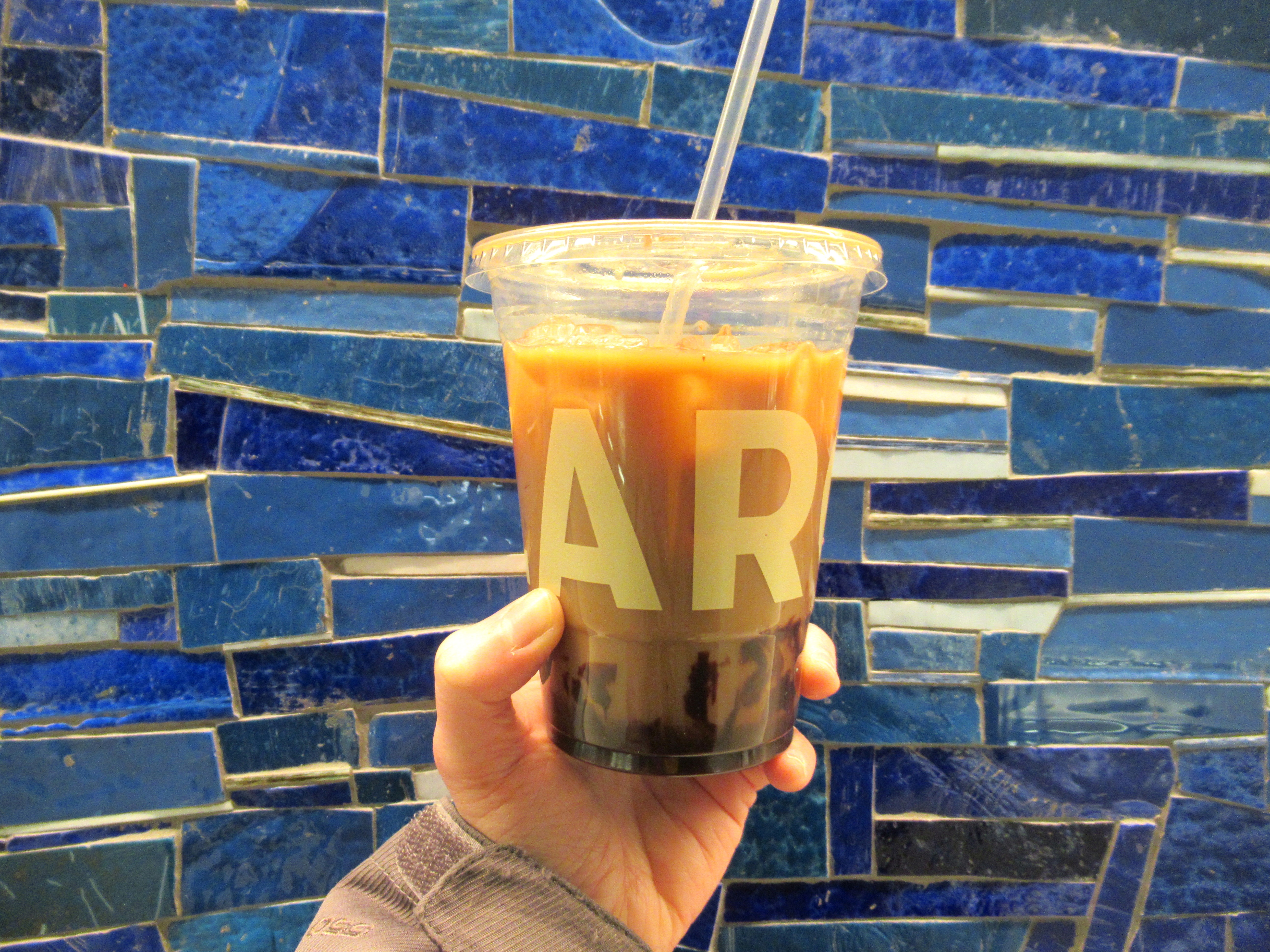 Bubble tea from a stall at Pier 57. A yuzu lemonade Arnold Palmer with lychee popping boba, rainbow jelly, and edible glitter.