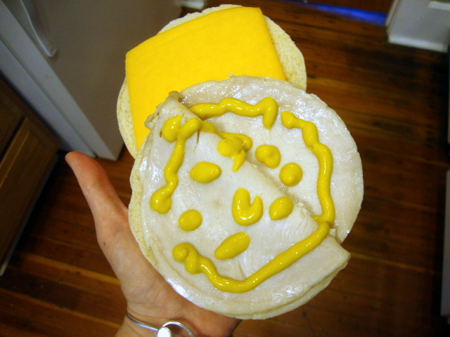 I ate a strange lunch-breakfast in class. A 2 slices of Applegate Farms turkey on a Sandwich Thin with yellow mustard and 2% colby sandwich.