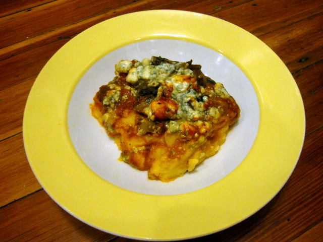 Dinner was Jenna’s Baked Polenta with Mushrooms, Gorgonzola Cheese, and Tomato Sauce.