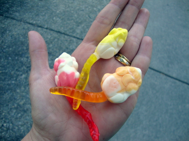 Adam handed me three gummi mice this afternoon. (His nickname for me is Mouse.)