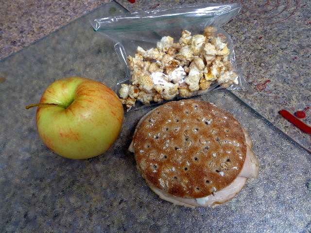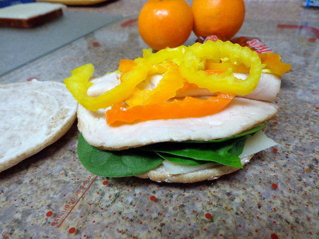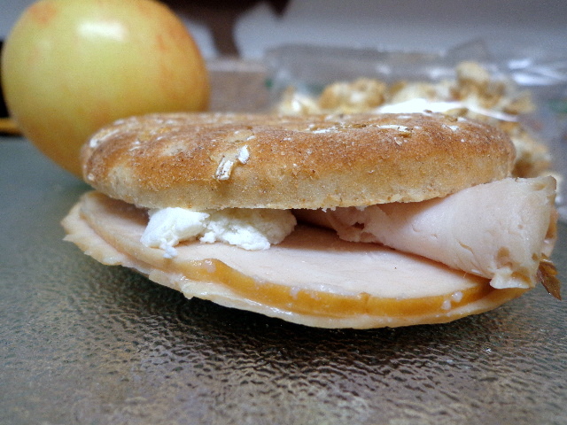 A whole wheat Bagel Thin topped with Applegate Farms roasted turkey, TJ’s pumpkin butter, and a TJ’s mini brie bite.