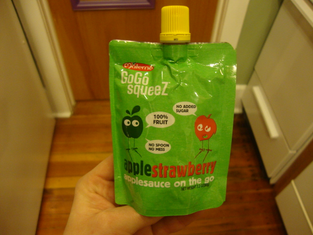 Yesterday morning I walked to school in just pants and a long sleeve T-shirt (spring came just in time for its break!) and ate breakfast during class. A GoGo Squeez Apple Strawberry pouch,