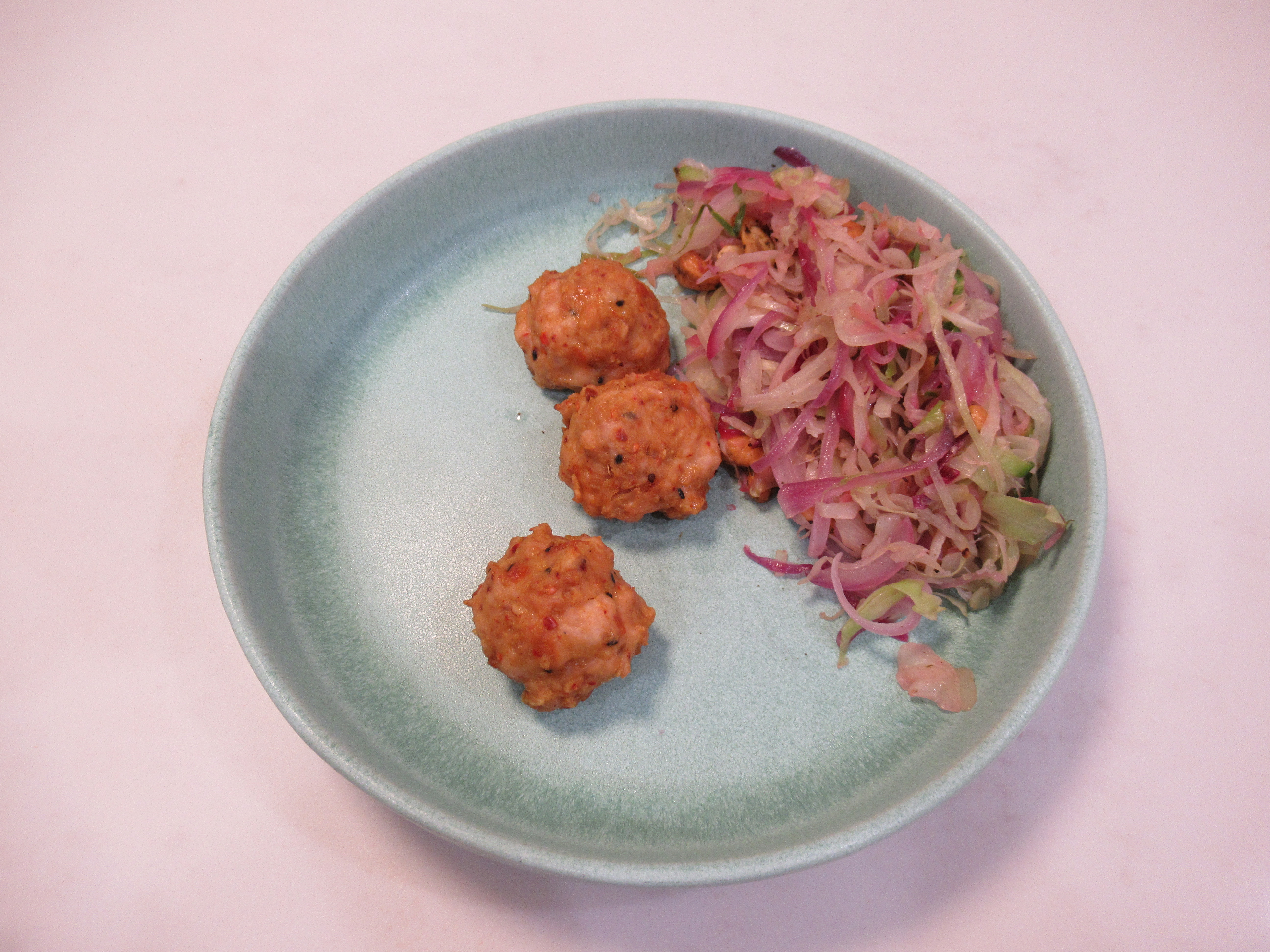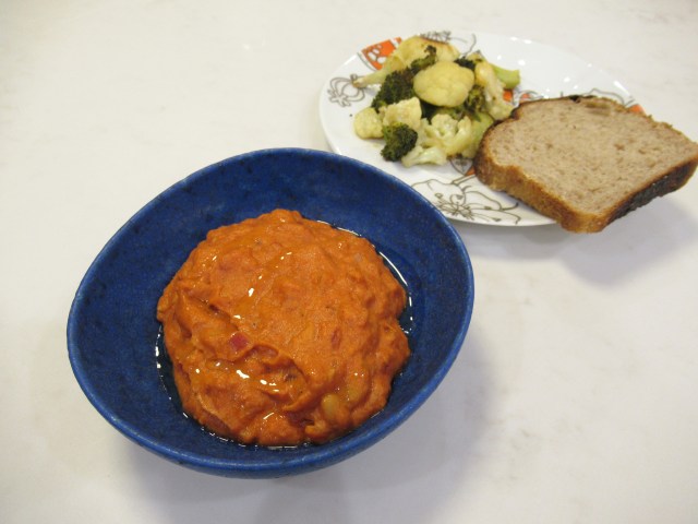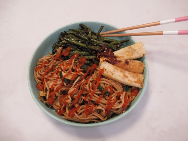 Greek-ish salad. Romaine, Trader Joe’s cilantro dressing, baby tomatoes, roasted zucchini, and roasted chickpeas (baked until crispy with evoo, salt, pepper, sumac, onion powder, and garlic powder). Plus Trader Joe’s dolmas.