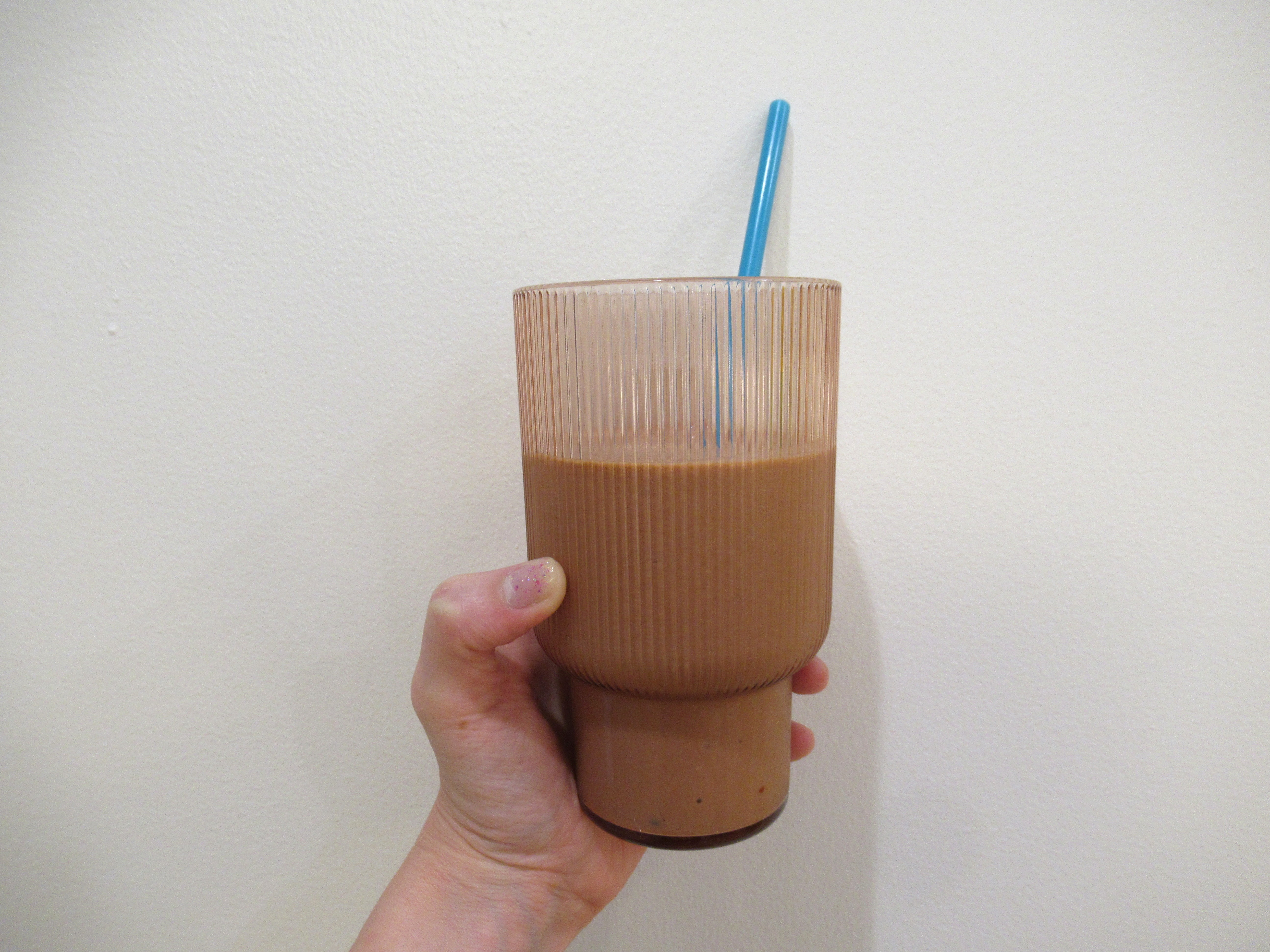 Berry smoothie. Frozen strawberries and blueberries, with chocolate protein powder, milk, and water. And a strawberry gummy.