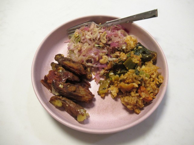 Crispy rice omelet. Eggs steamed on top of crisped-up leftover brown rice, kimchi, and extra-sharp cheddar. Plus roasted broccoli and baked chicken on the side.