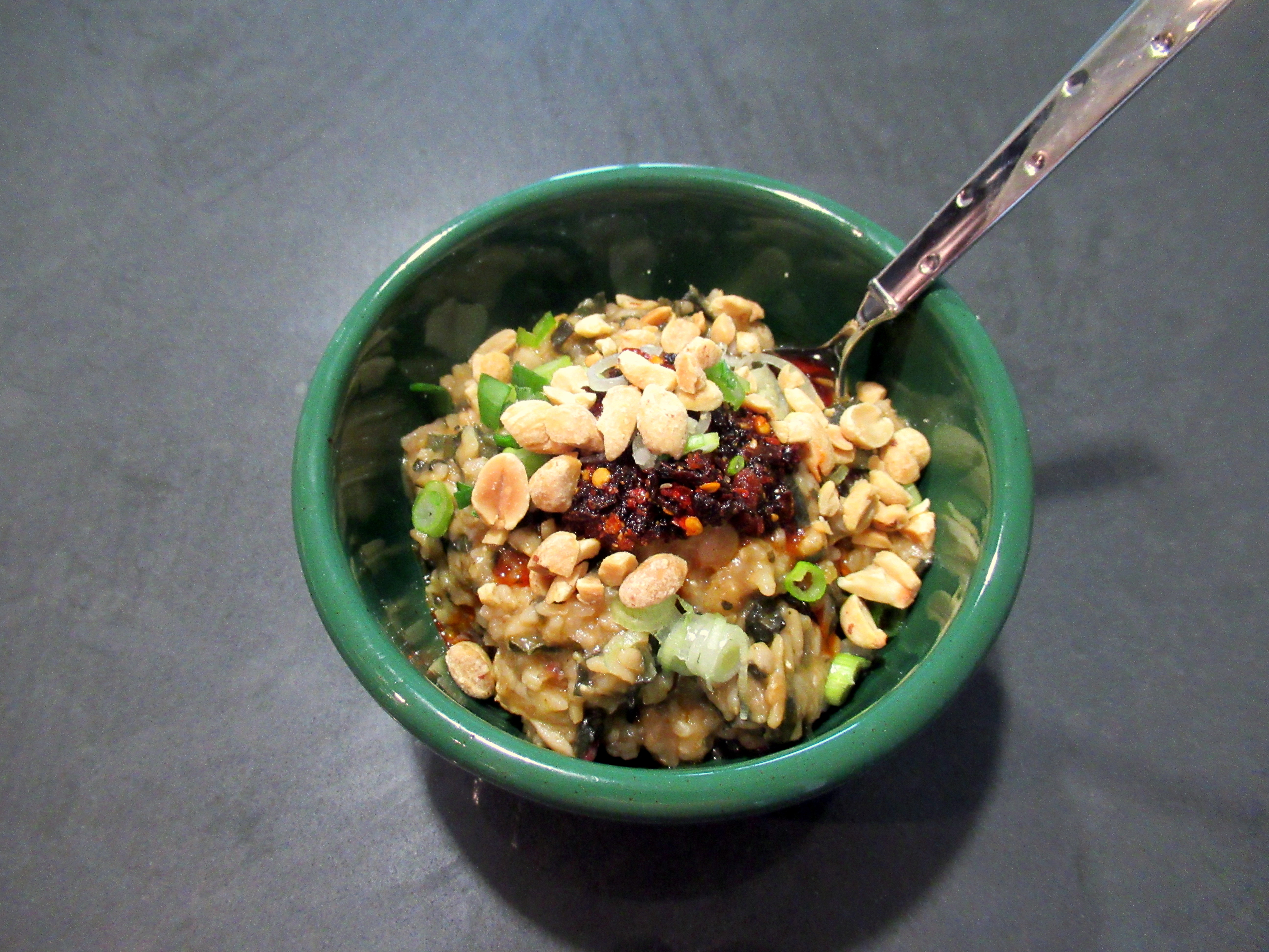 Congee (brown rice cooked for an hour and a half in turkey stock) / layered with collard greens sauteed with green onion and ginger / and ground turkey sauteed with white onion, garlic, and Korean pepper / topped with chili crisp and green onions.