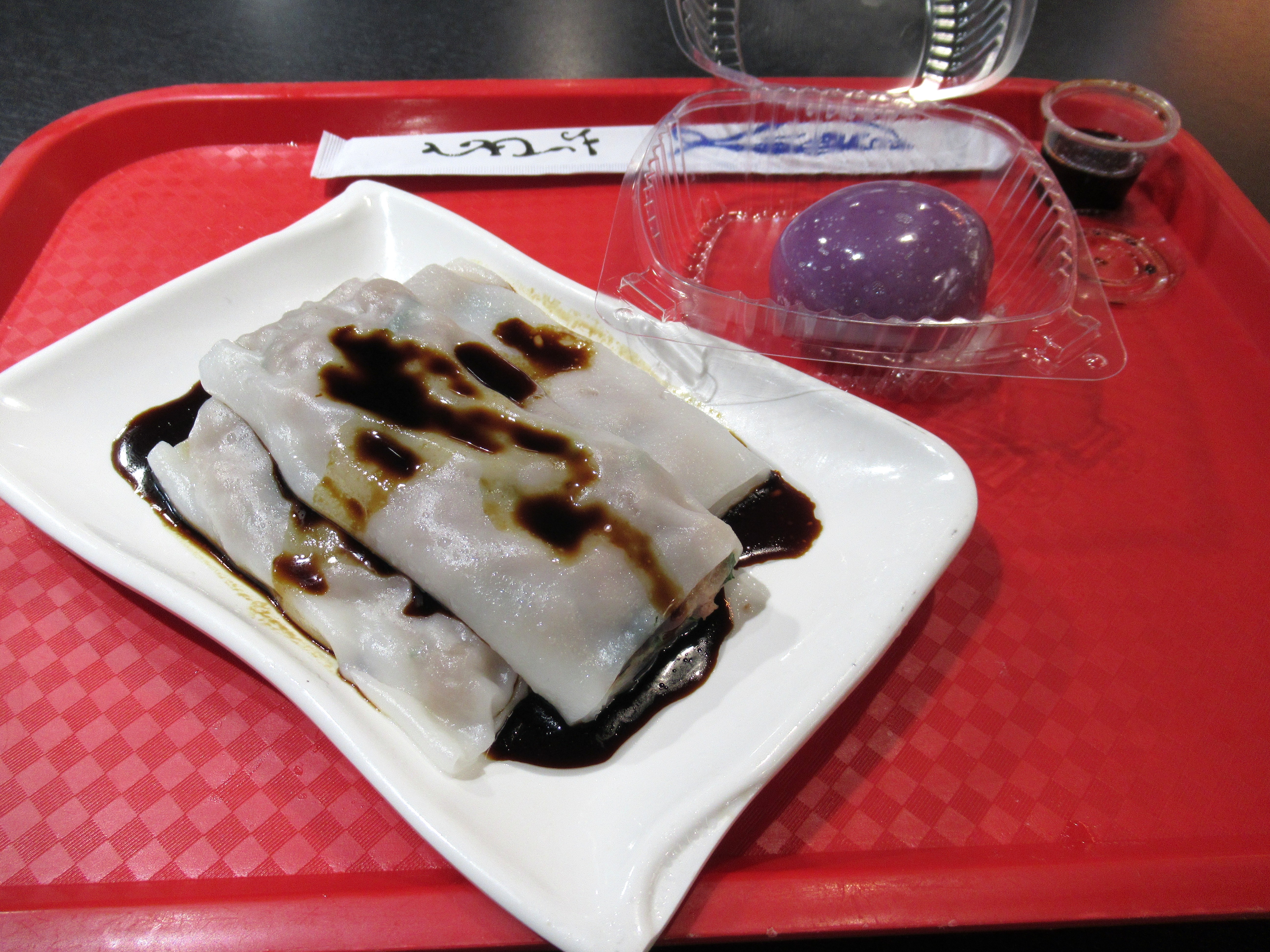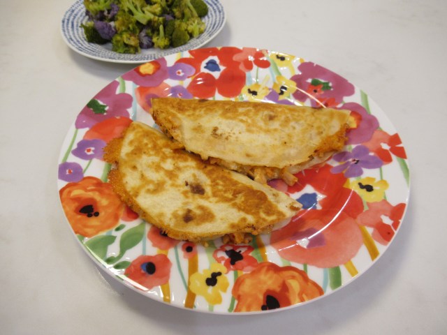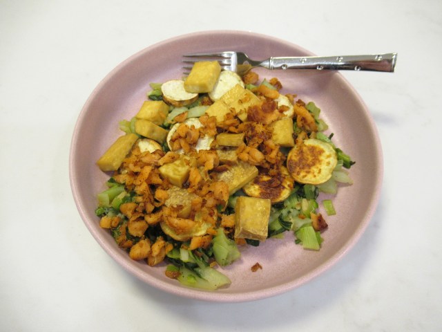 Cold egg tofu and roasted broccoli with a spicy sauce (soy sauce, sesame oil, chili onion crunch, sugar, garlic, and rice vinegar).