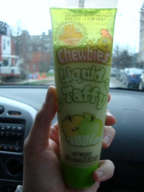 Not a win, was the fact that we were busy straight through lunch and ended up not eating anything. By 5:30 when we left the mall I was having a definite panic attack of hunger. I ended up randomly grabbing this Liquid Taffy candy to split with Adam.