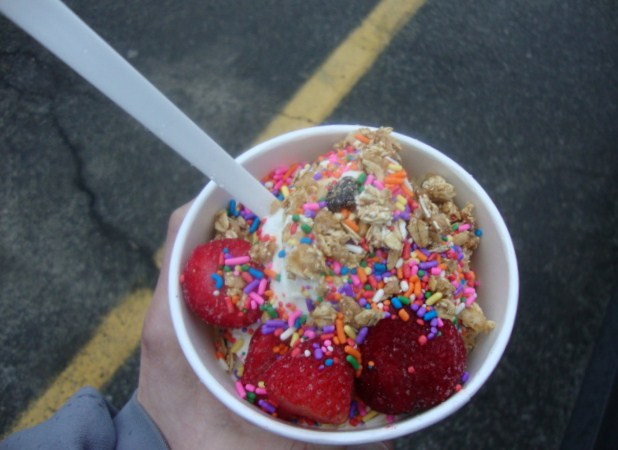 Fat free chocolate and vanilla twist, topped with strawberries, sprinkles, and granola.