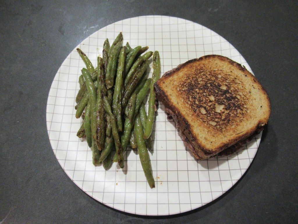 Tuna salad with an Eastern European vibe. Canned tuna and smoked trout / mayo, skyr, Dijon, and tons of horseradish / green onion / pickled beets / hard-boiled eggs. Plus sauteed asparagus and Trader Joe’s cornbread crackers.