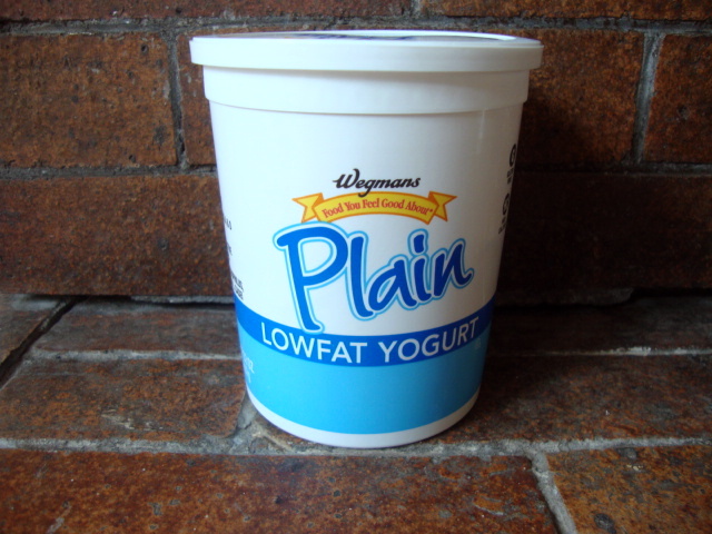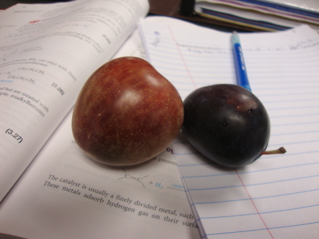 Yogurt bowl – plain Greek with chopped red plum, granola, chia, and sprinkles.