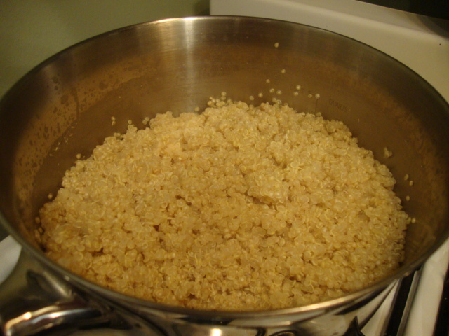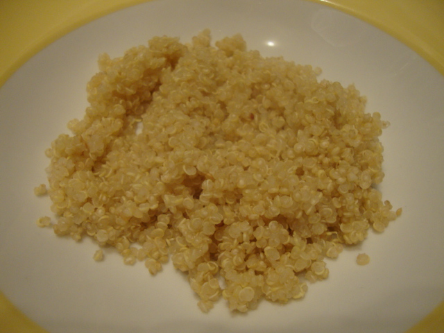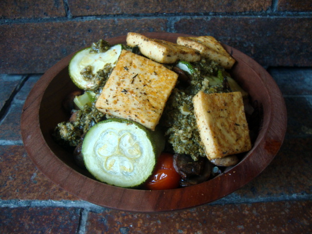 White quinoa / red lentils with lemon, tomato paste, and ginger / roasted zucchini and garlic sautéed mushrooms.