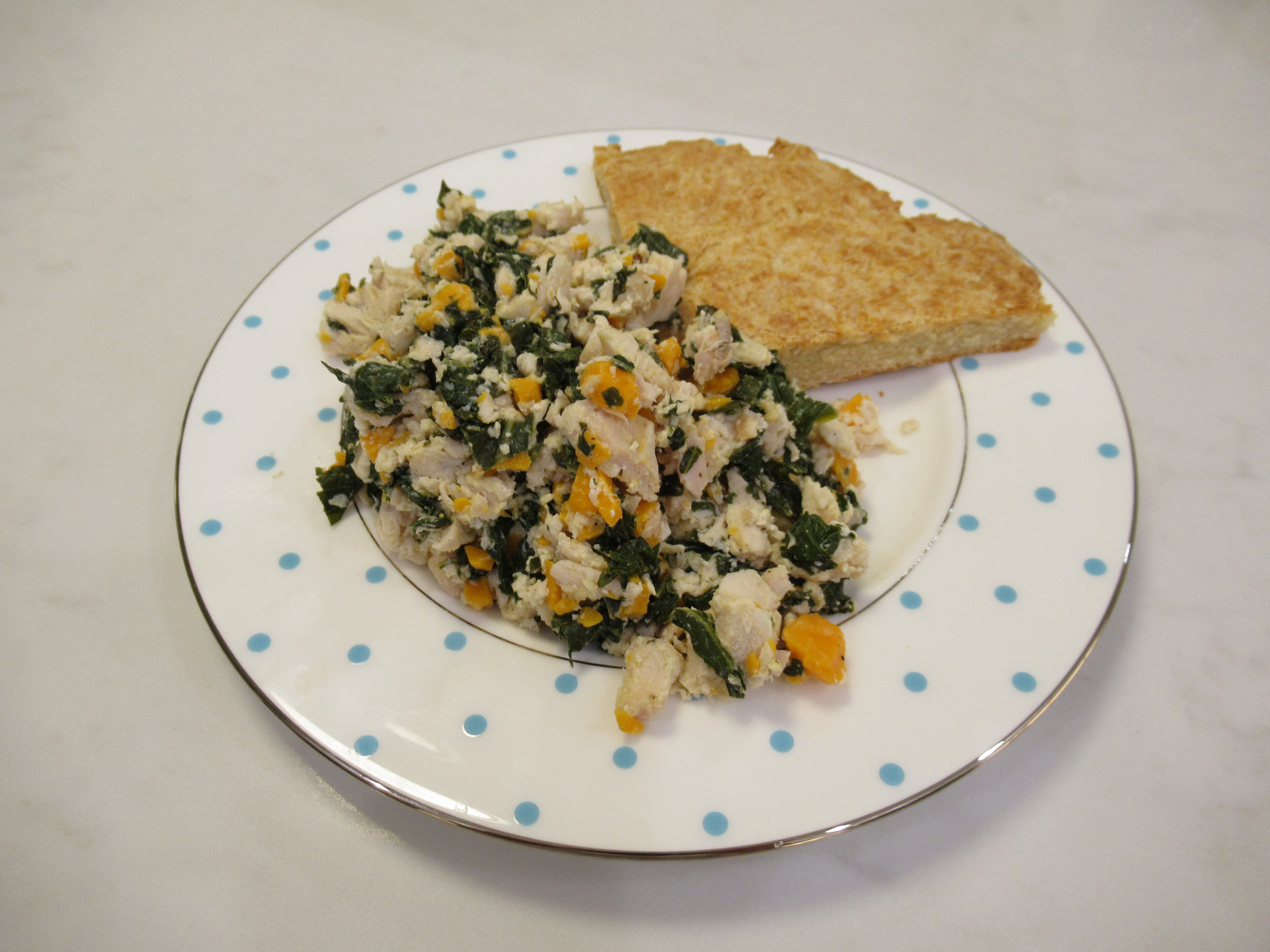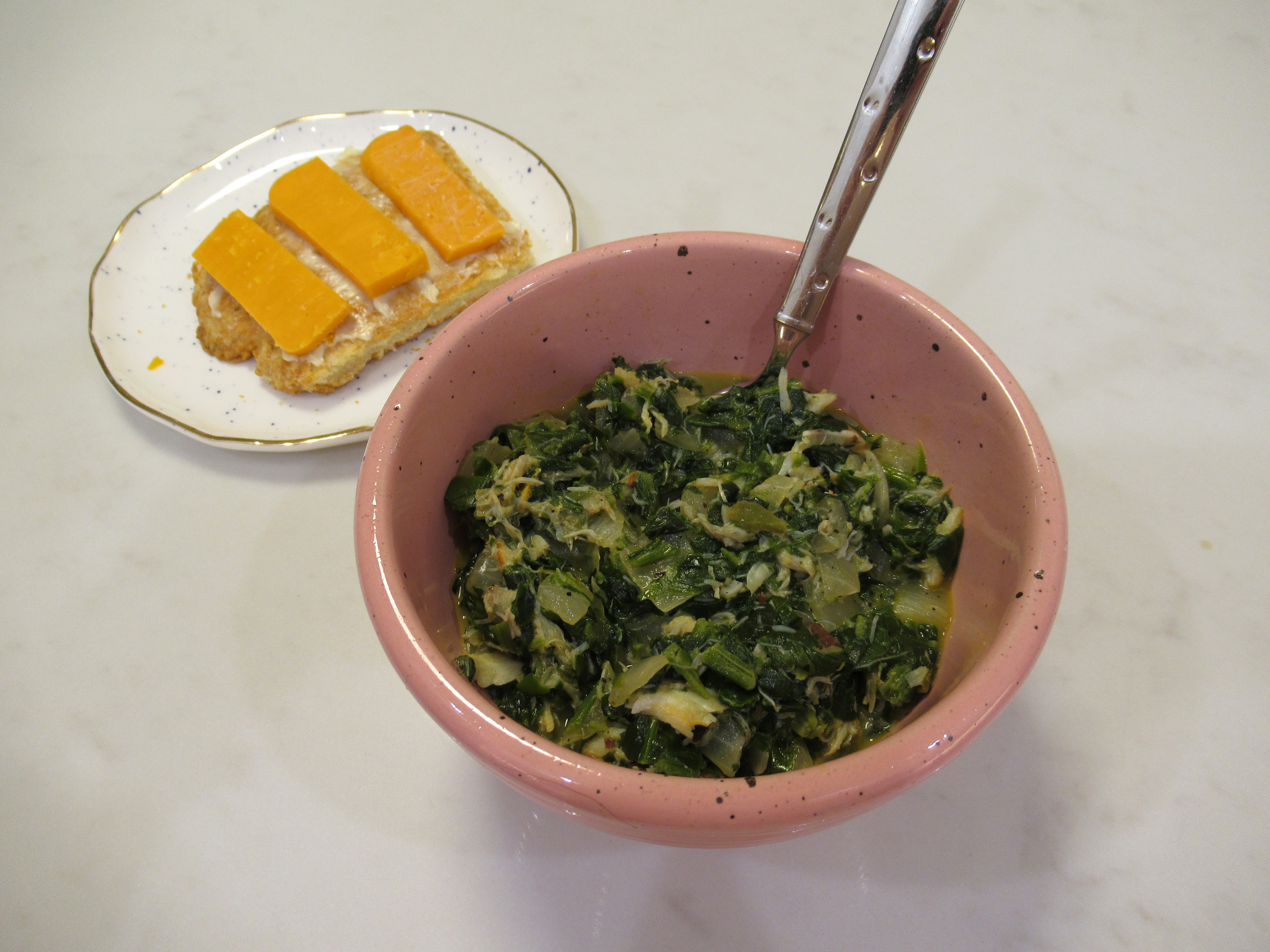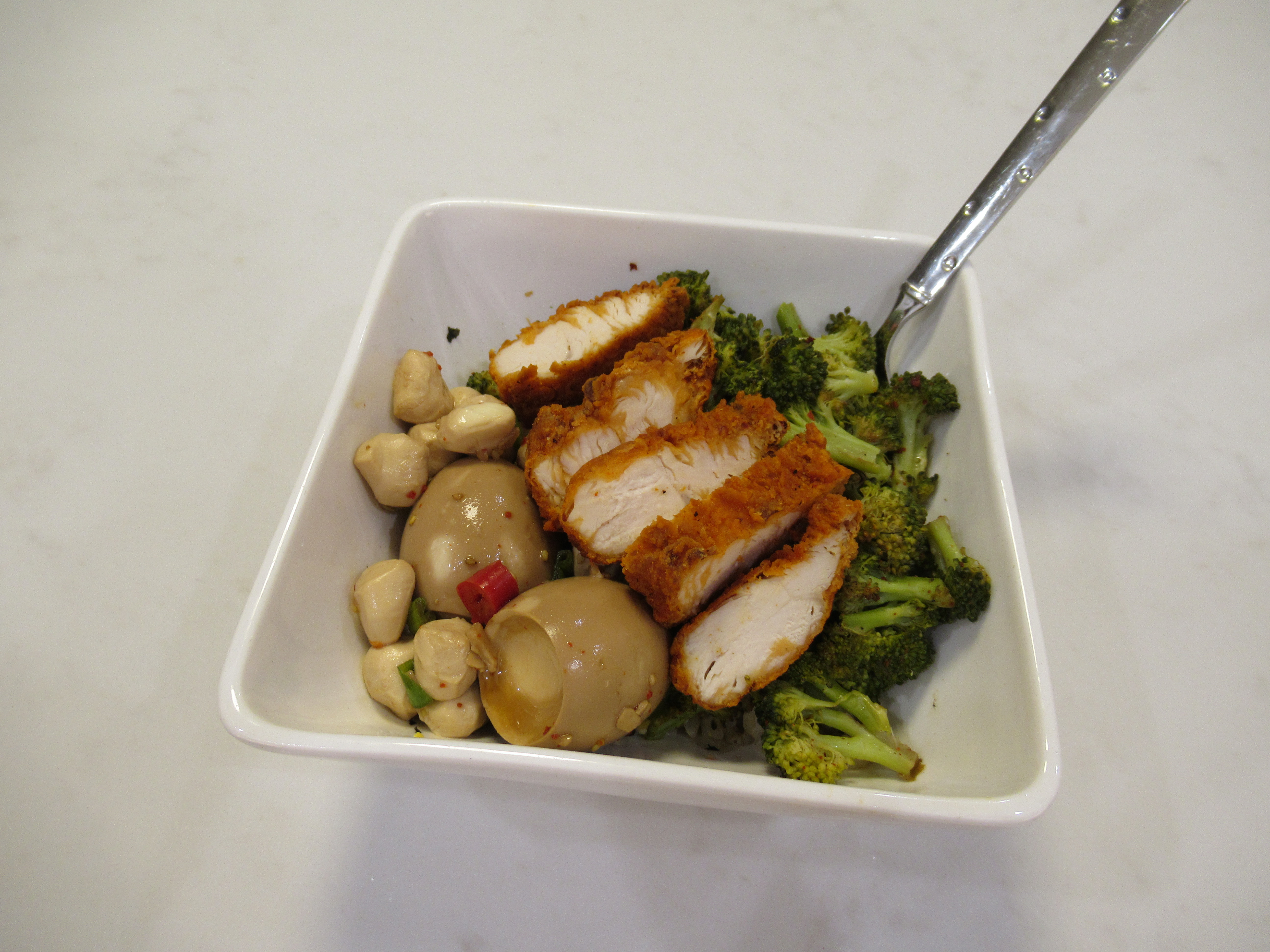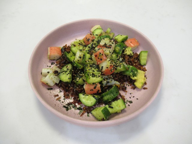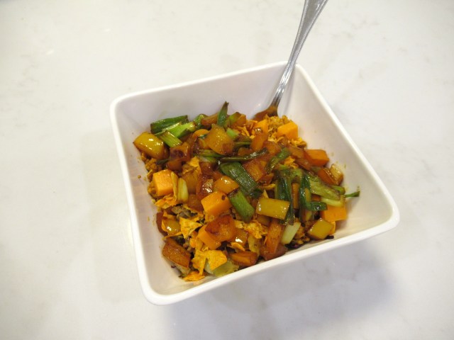 Crispy rice omelet. Eggs steamed on top of crisped-up leftover brown rice, kimchi, and extra-sharp cheddar. Plus roasted broccoli and baked chicken on the side.