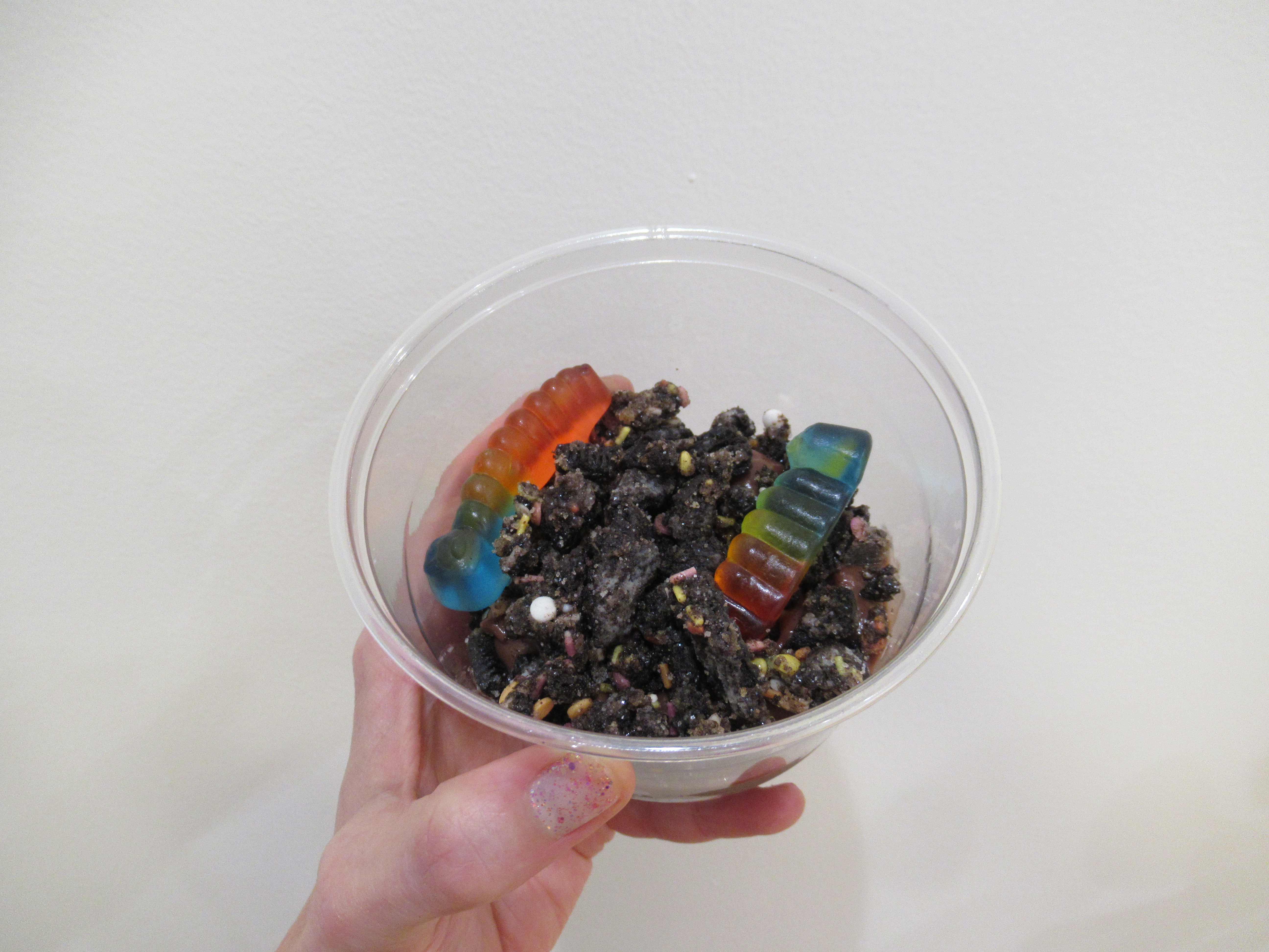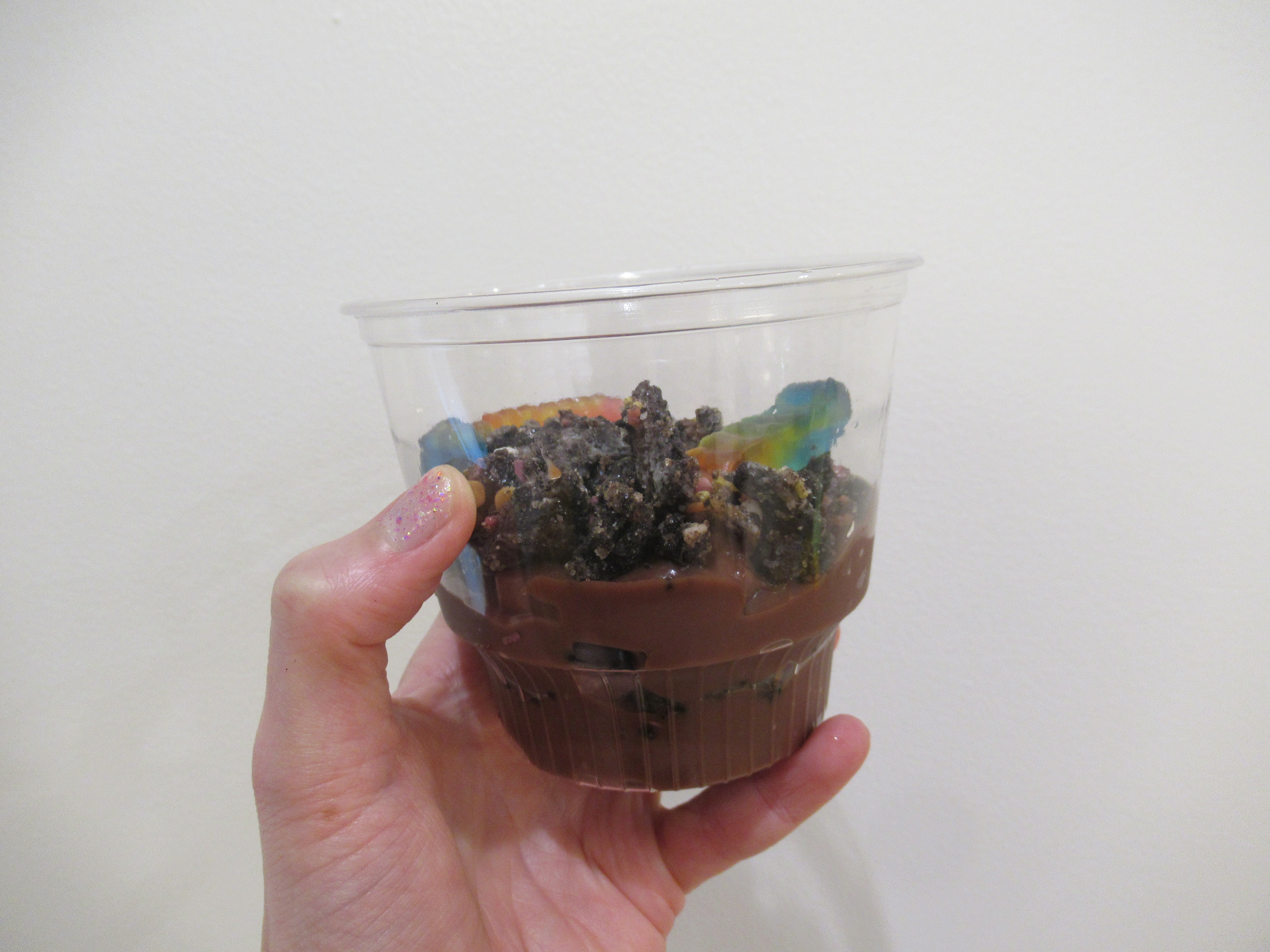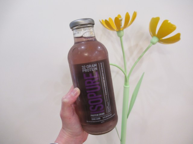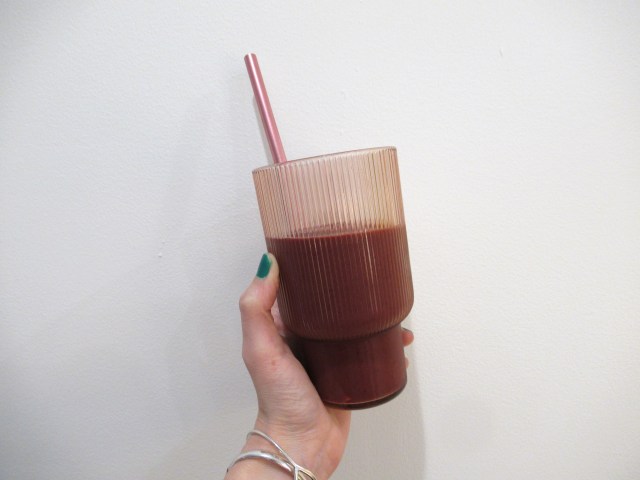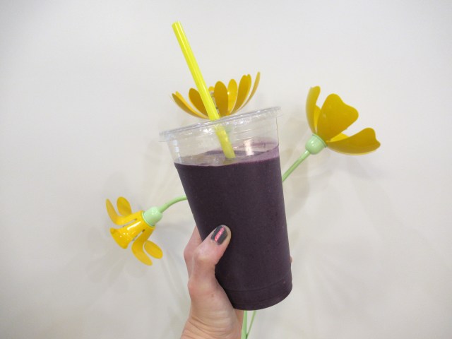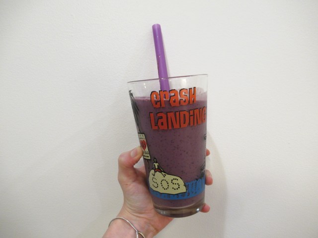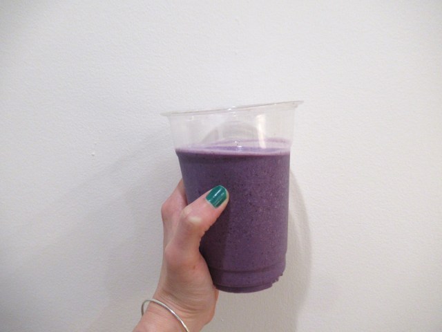 Berry smoothie. Frozen strawberries and blueberries, with chocolate protein powder, milk, and water. And a strawberry gummy.