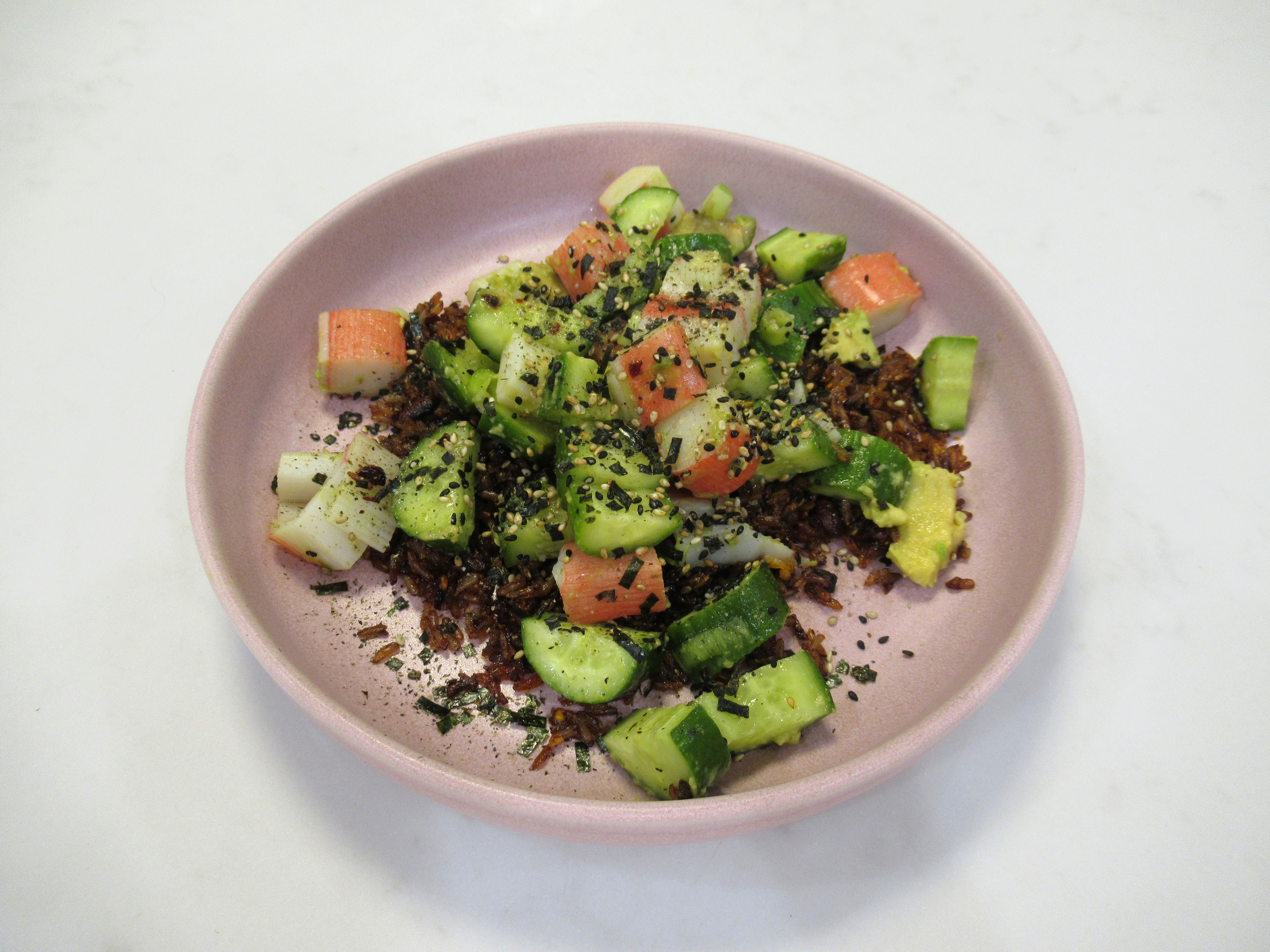Braised tofu bowls. Brown rice with roasted cauliflower rice / sauteed bok choy with green onion / firm tofu cooked in butter and braised in chicken broth, rice vinegar, gochujang, gochugaru, Sichuan pepper, sugar, and sesame seeds / cashews.