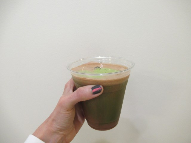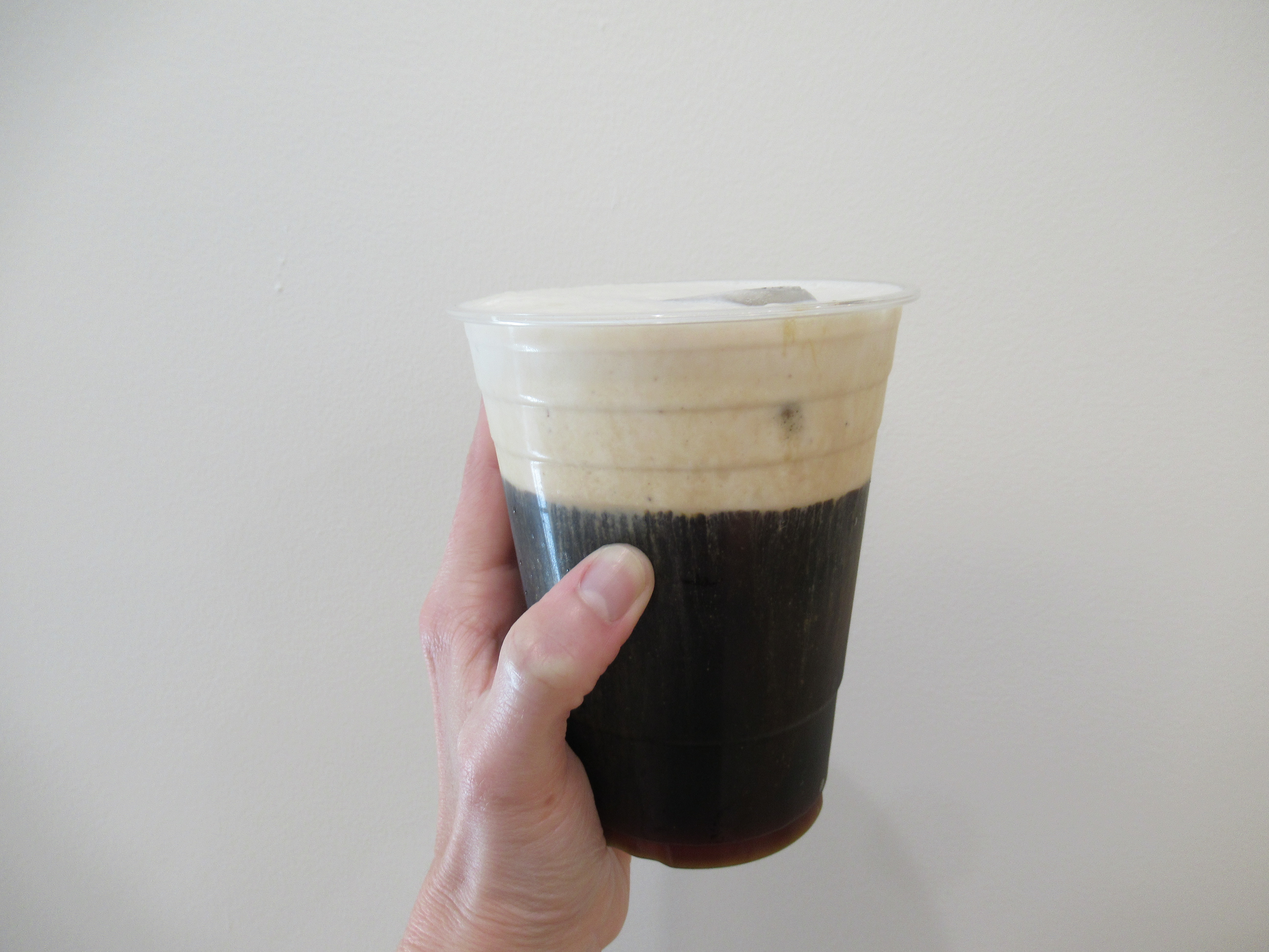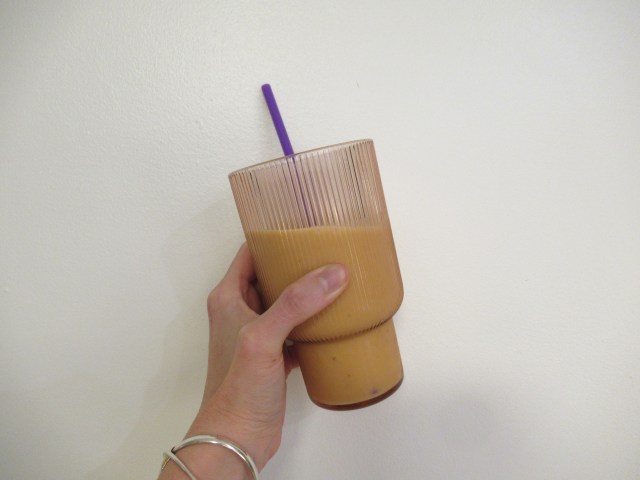 Horchata-ish iced latte. I blended leftover brown rice, milk, brown sugar, cinnamon, and vanilla bean powder in the blender. Unstrained, with ice, half and half, and espresso.