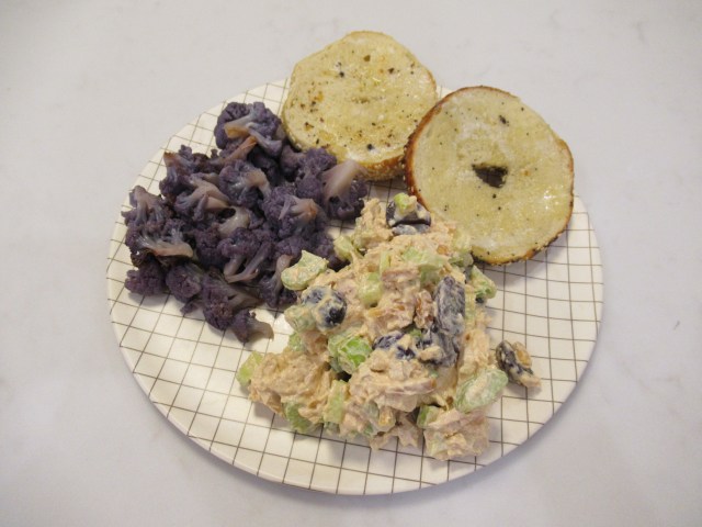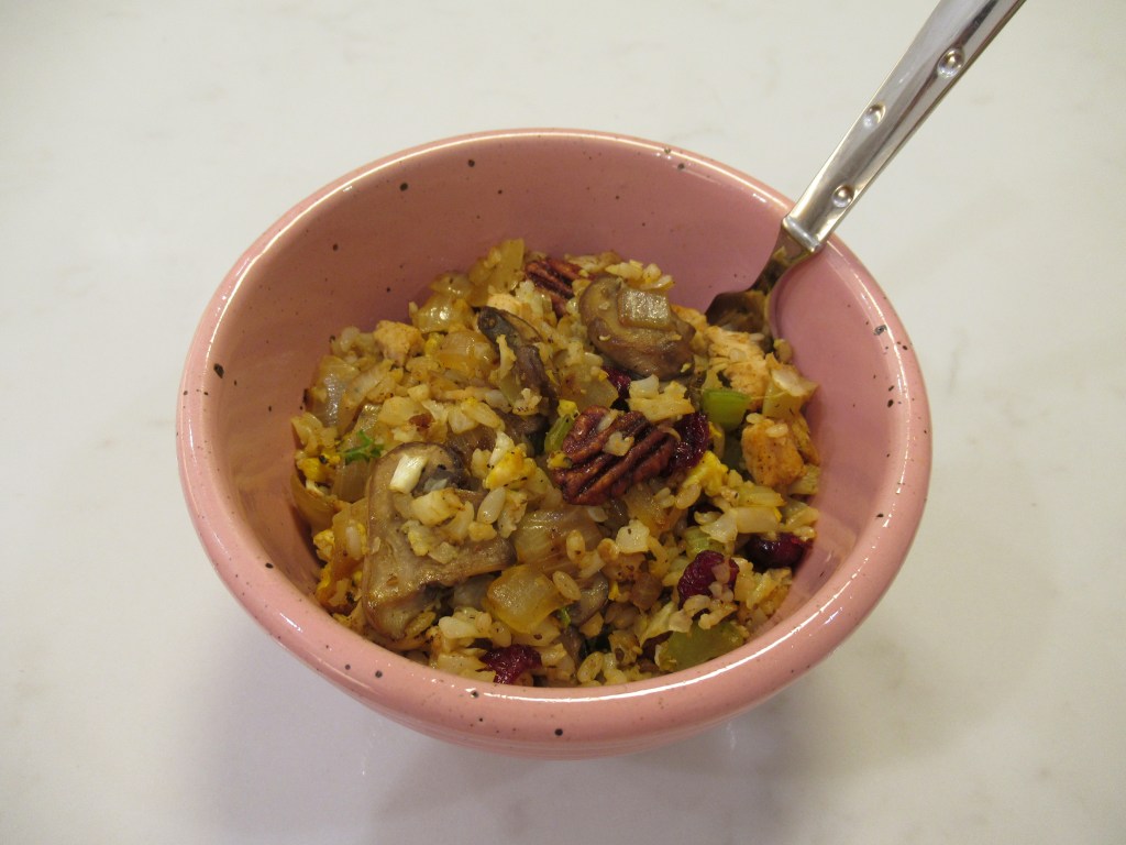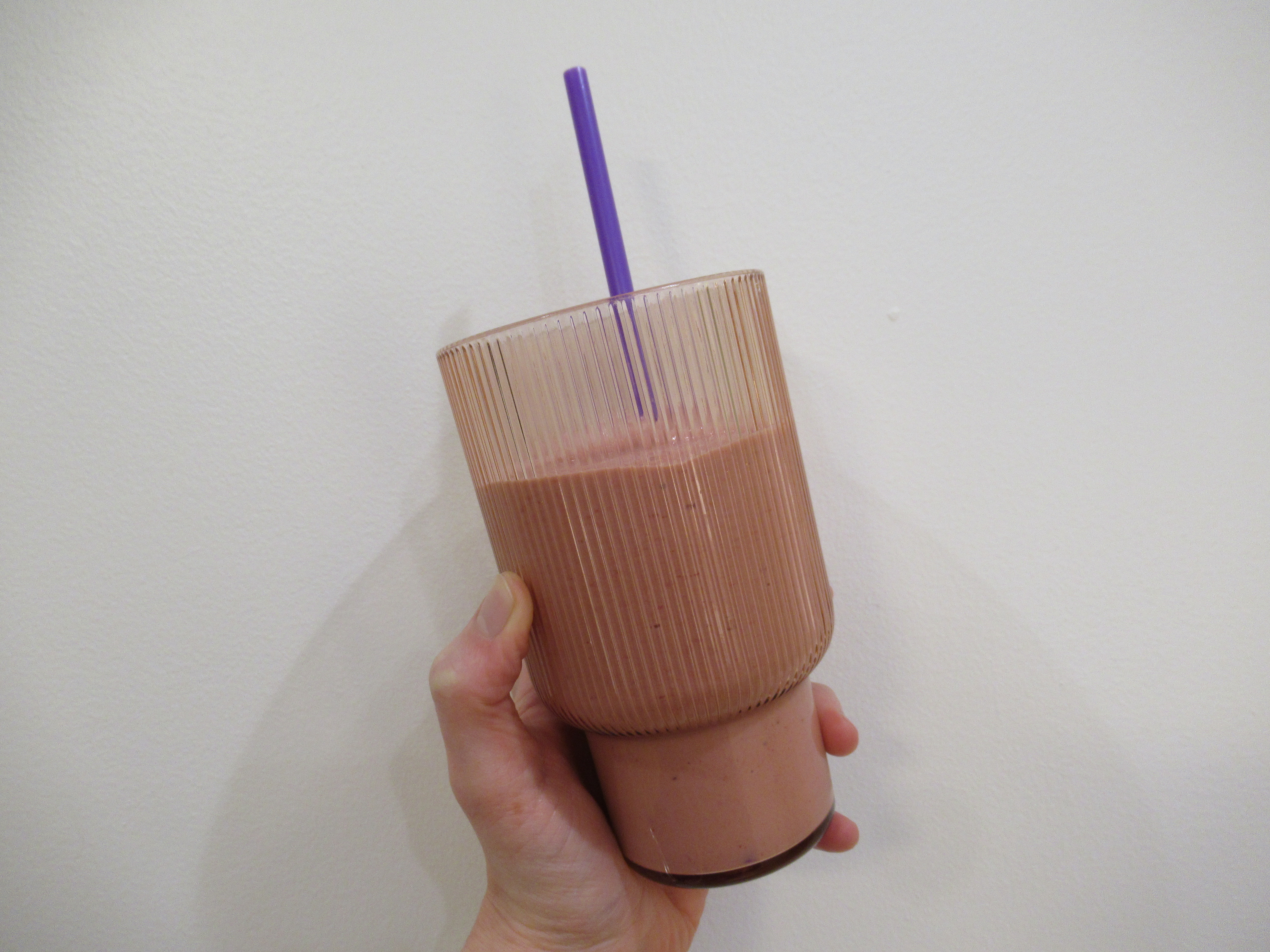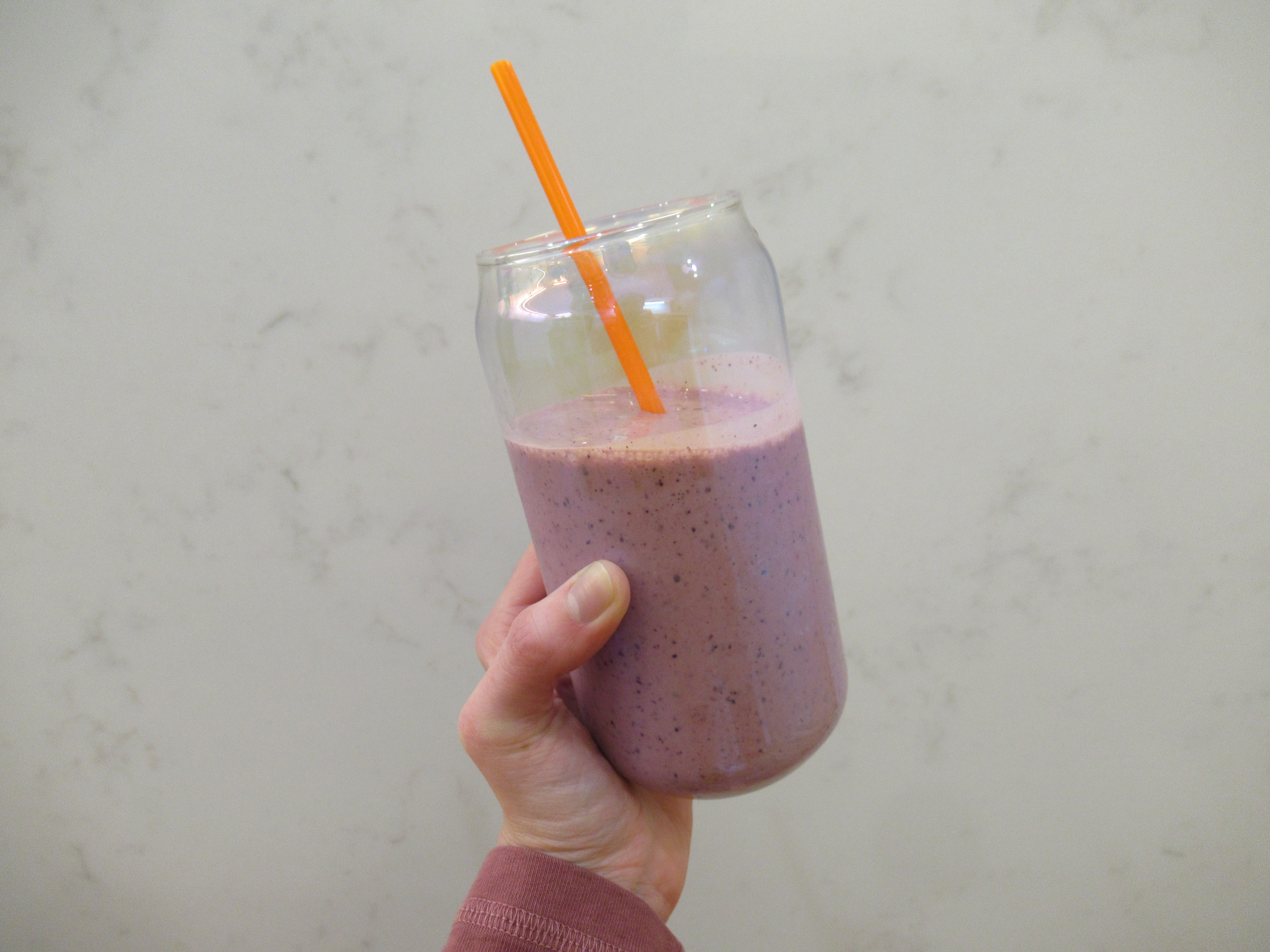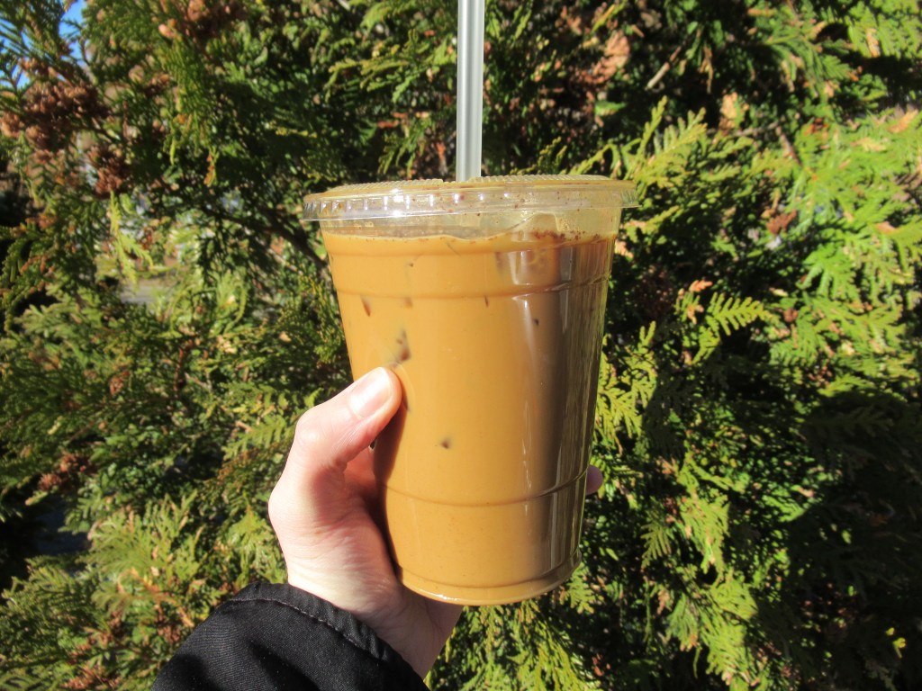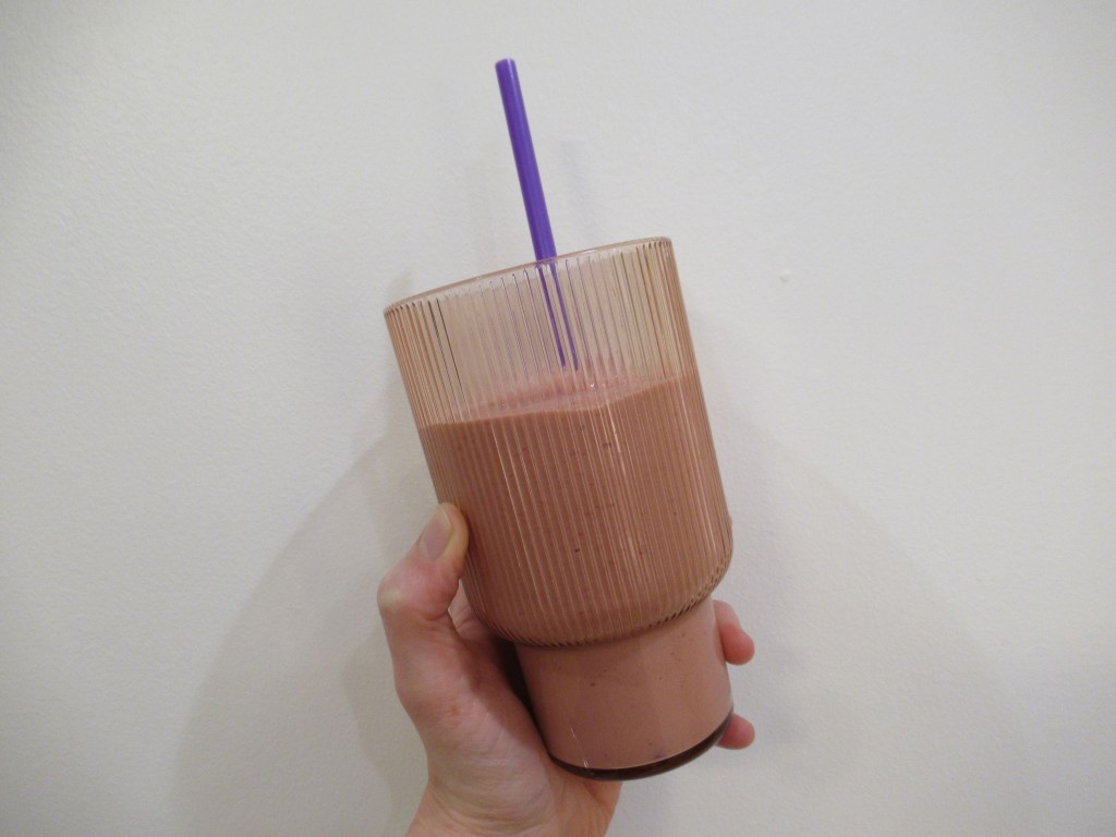 Pumpkin smoothie – canned pumpkin with frozen banana, vanilla protein powder, cinnamon, nutmeg, maple sugar, and water.