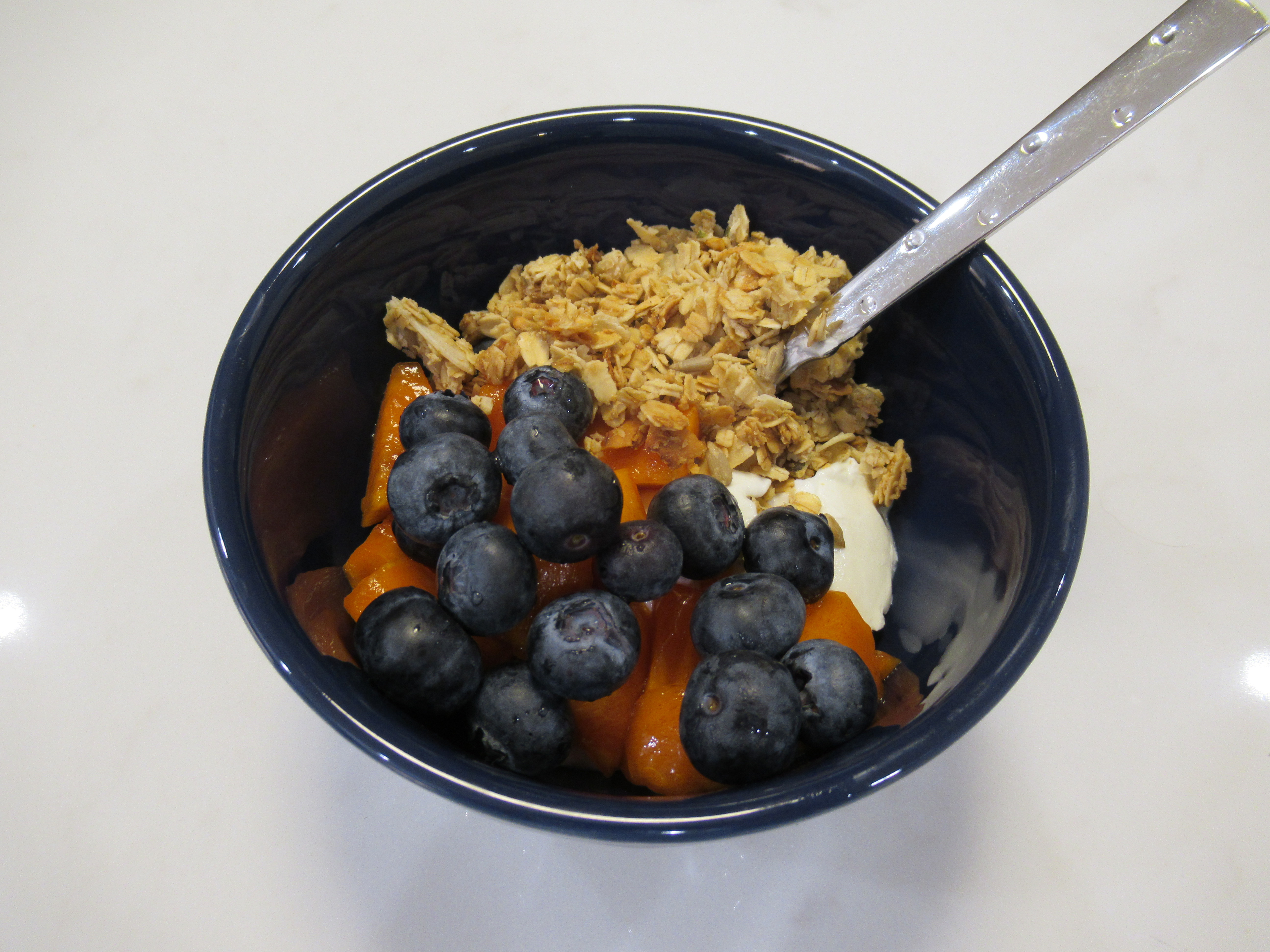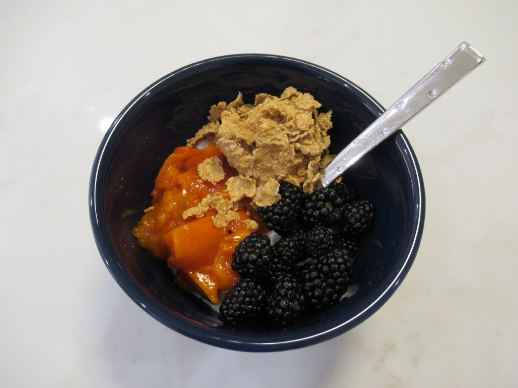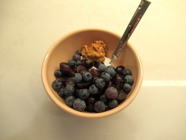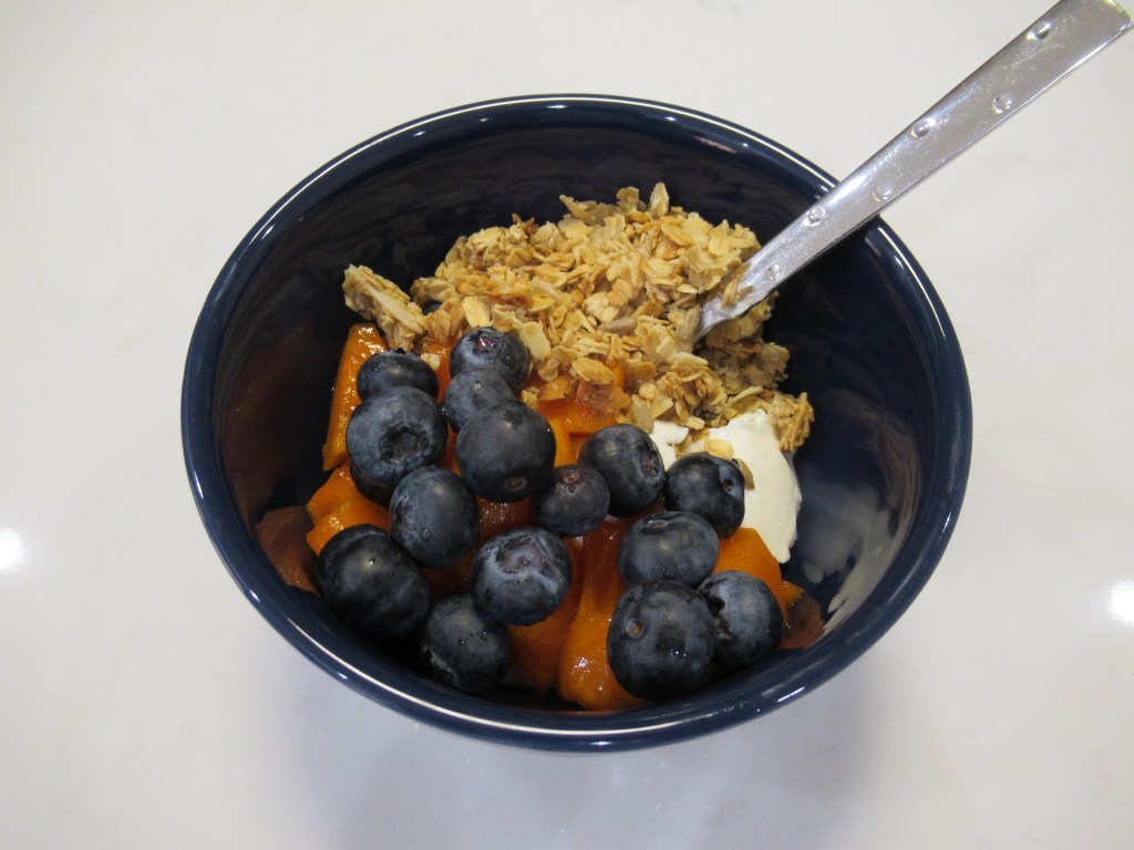 Pumpkin spice Chobani with Whole Food’s cinnamon granola and blueberries.