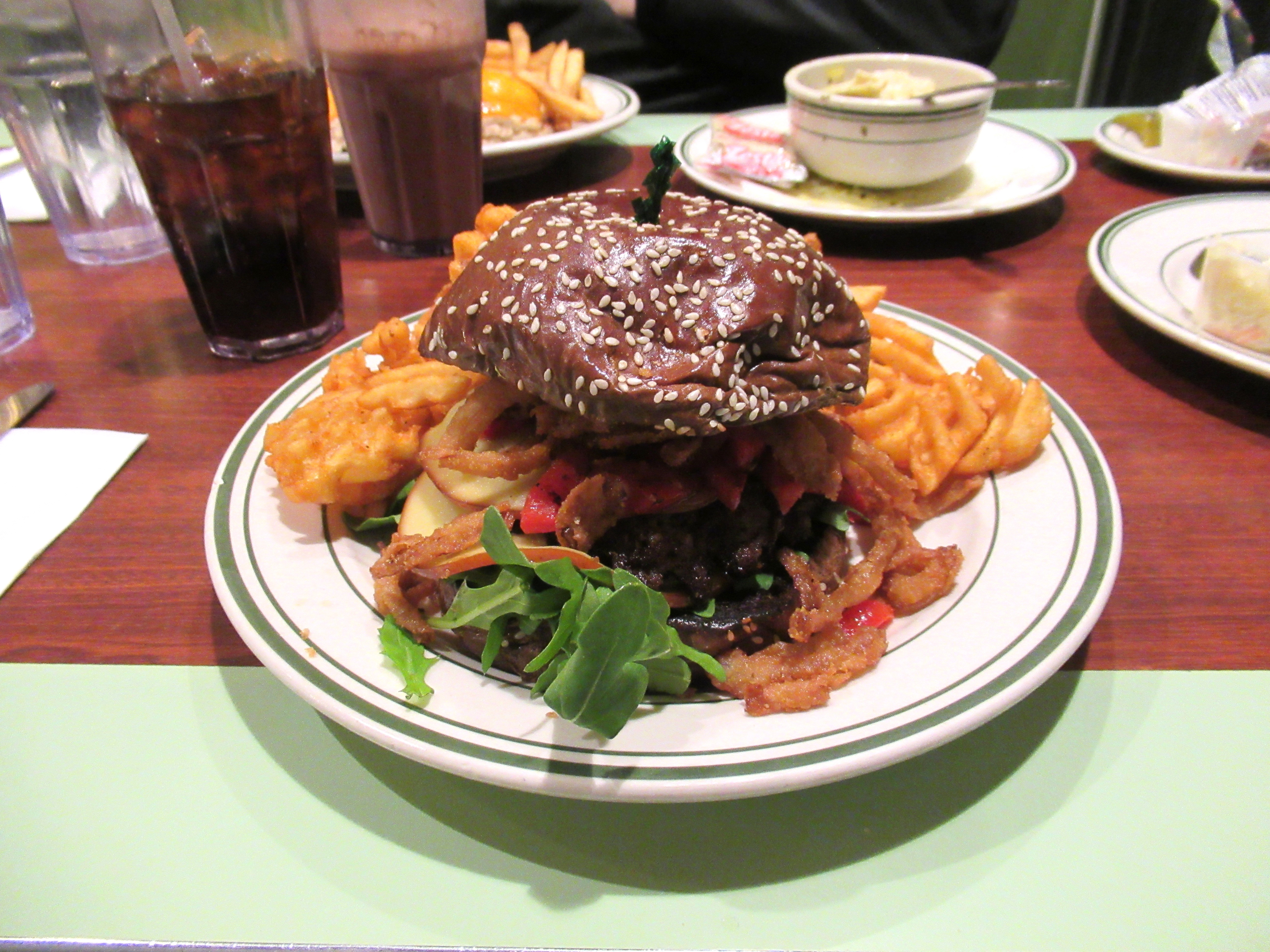 I got the Goldburger – double smash patties with smoked gouda, crispy onion strings, fire-roasted peppers, and hot honey truffle sauce on a dark pumpernickel bun. I loved it; doesn’t make my top five list but definitely top ten. With solid but not perfect waffle fries.