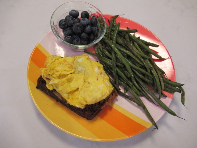And, of course, I toasted thick slices to be the B in BEC (banana bread, soft-scrambled eggs, extra-sharp cheddar). Served with blueberries and roasted green beans.