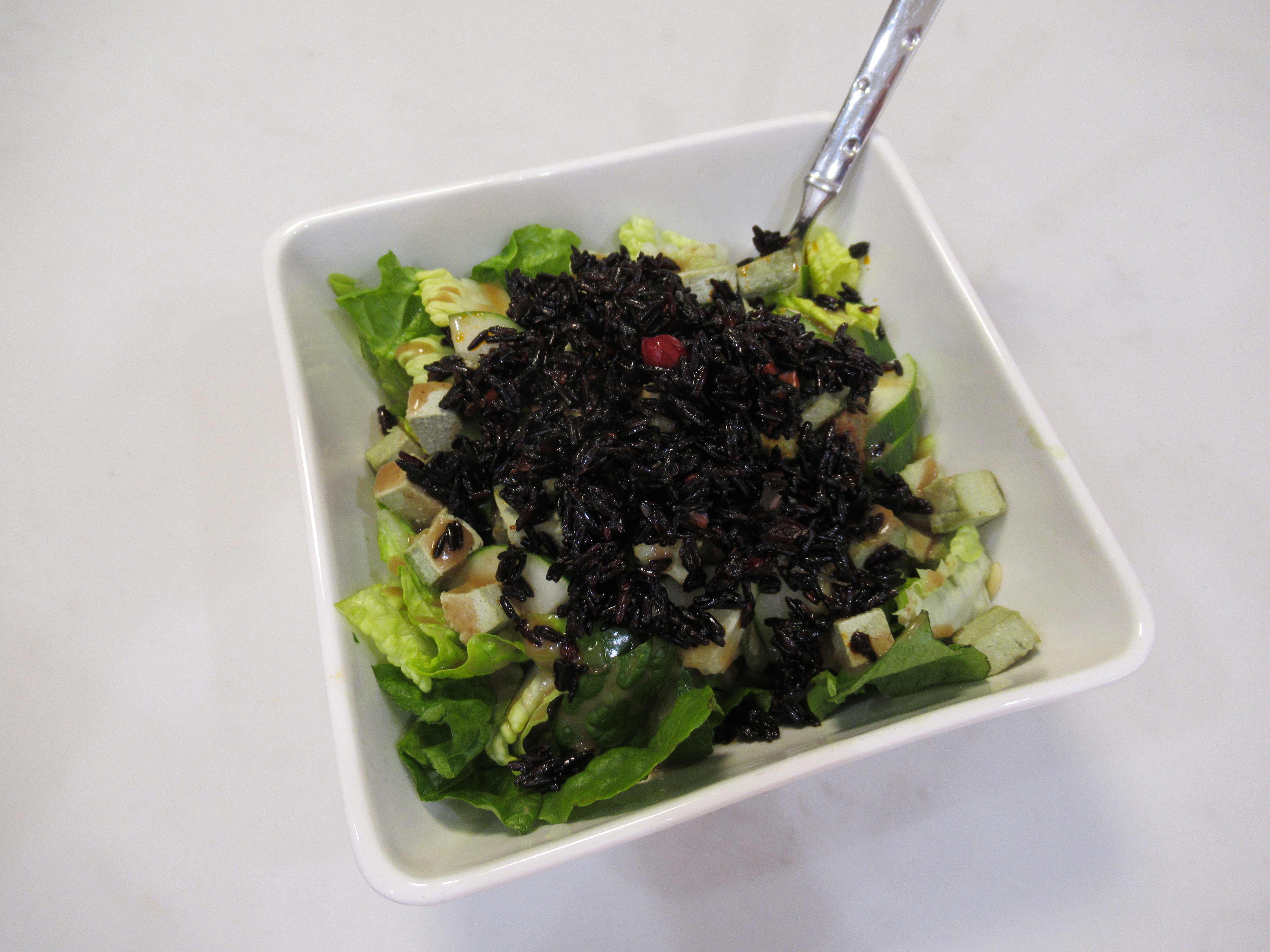 Big salads. Romaine / cucumber / balsamic vinaigrette / roasted pumfu (pumpkin seed tofu) / crispy rice (leftover black rice roasted with soy sauce, sesame oil, and chili crisp).