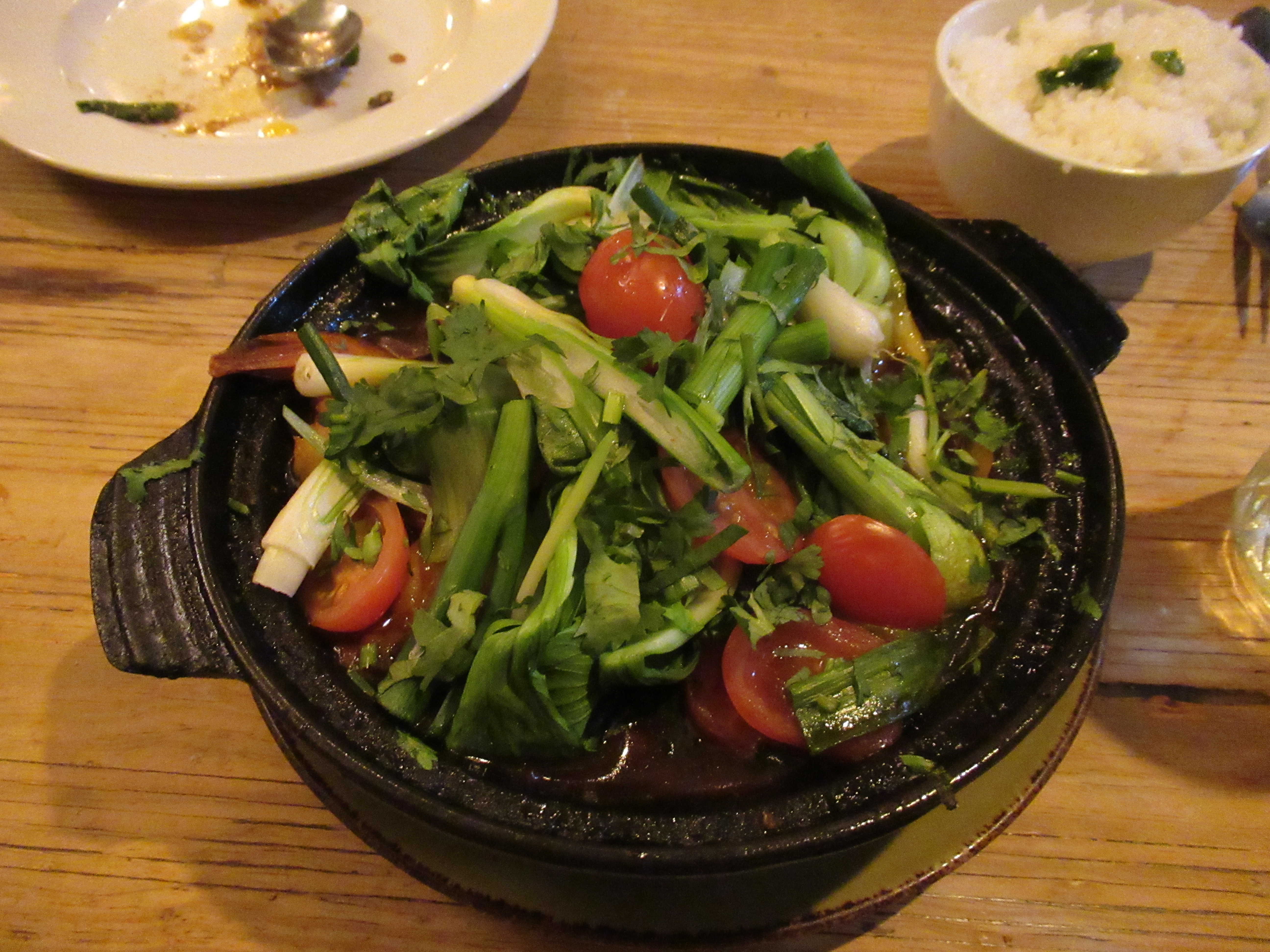 Caramelized shrimp pot – Gulf shrimp, baby bok choy, onion, cherry tomato, and scallions in a caramel-chili sauce. This is my favorite dish on the menu!