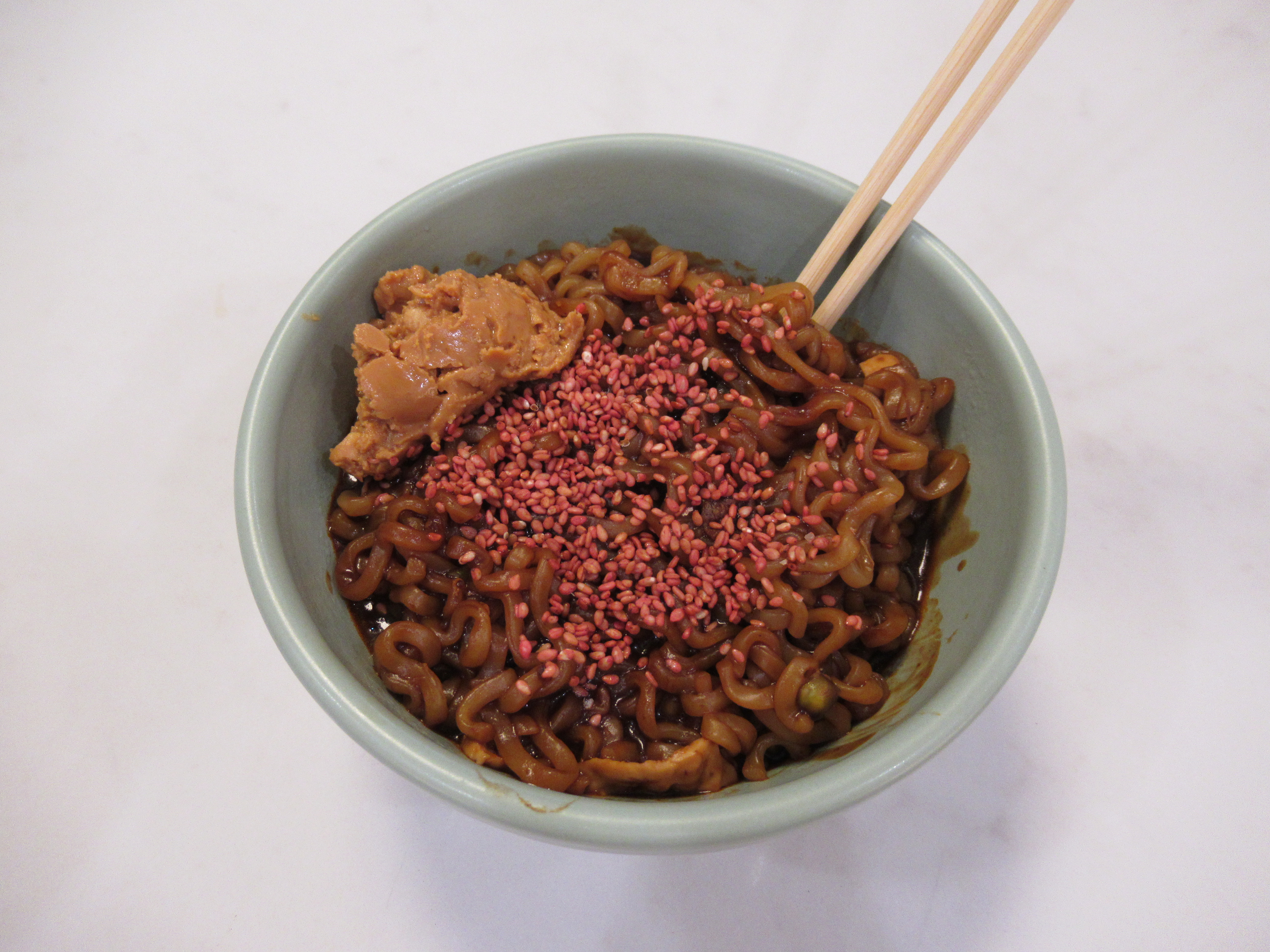 Buldak Korean black bean sauce ramen. I added an egg, sesame seeds, and scoop of peanut butter.