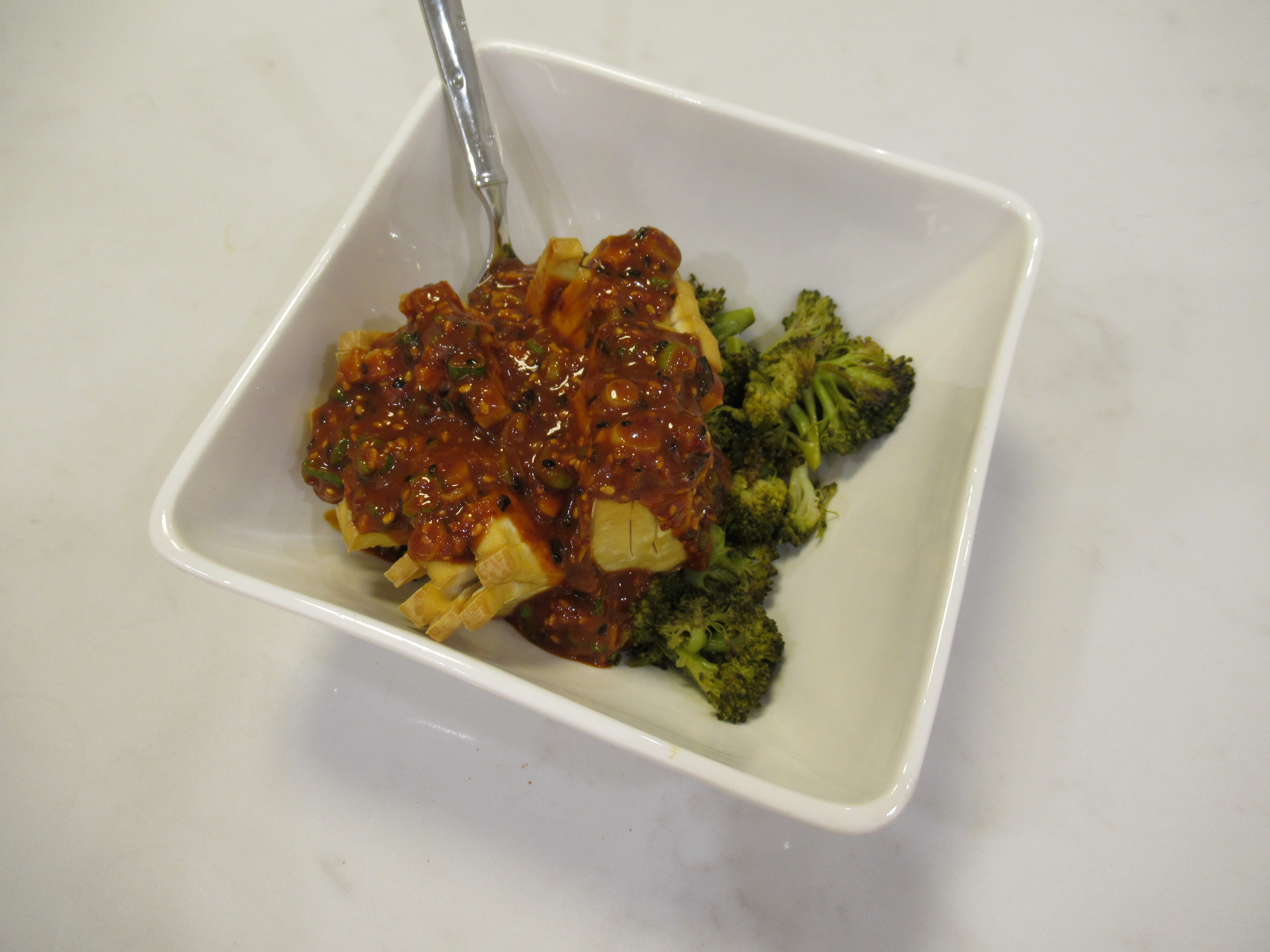Roasted broccoli and super-firm tofu with a spicy peanut butter sauce (chunky peanut butter, gojuchang, gochugaru, soy sauce, dark soy sauce, rice vinegar, brown sugar, garlic, and water).