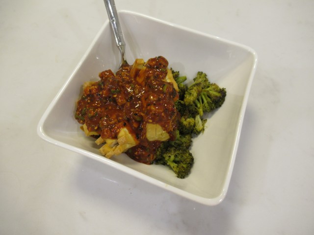 This meal was a watery fail and I am blogging it to remind myself not to put cold silken tofu on top of dumplings again. Silken tofu / pan-fried Trader Joe’s Thai shrimp gyoza / celery and green onion sauteed with garlic, Sichuan pepper, and white pepper / homemade dumpling sauce – rice vinegar, soy sauce, dark soy sauce, rice wine, sesame oil, chili oil, sugar, sesame seeds, green onion, and chopped smoked almonds.