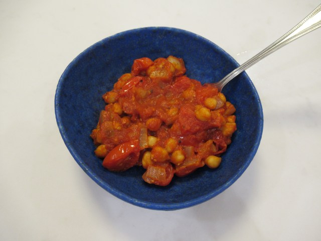 Saucy chickpeas. Yellow onion sauteed with grape tomatoes, tomato paste, garlic, harissa, smoked paprika, cinnamon, garlic powder, onion powder, salt and pepper, and butter.