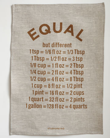 This towel is cute and useful. I know I should know most of the exchanges (the RD exam actually tests you on some of them!) but I still get stuck on the whole pints, quarts, gallons thing. The “cook” and “bake” towels are equally adorable.