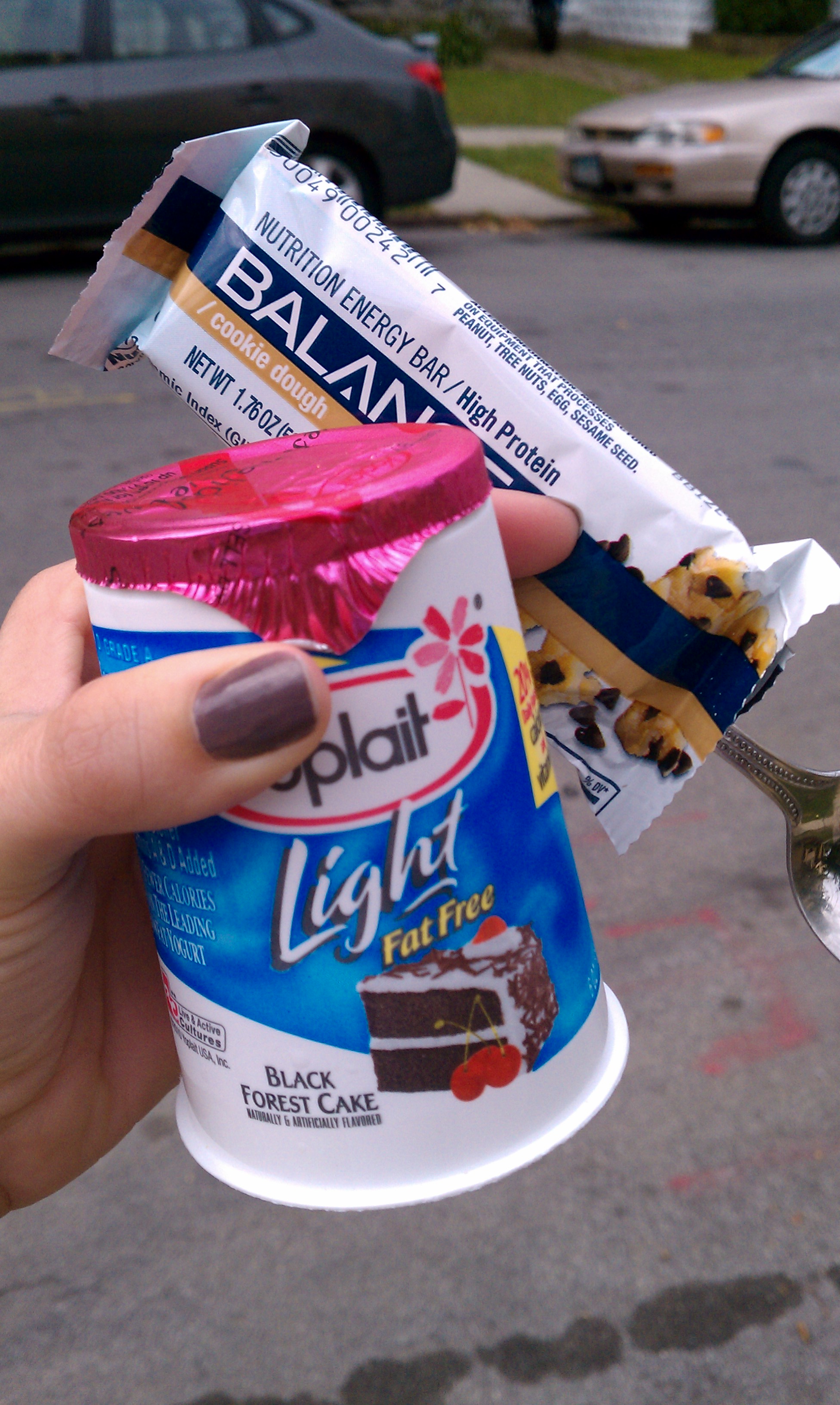 A vanilla Dannon with half a serving of Frosted Flakes and strawberry jam.